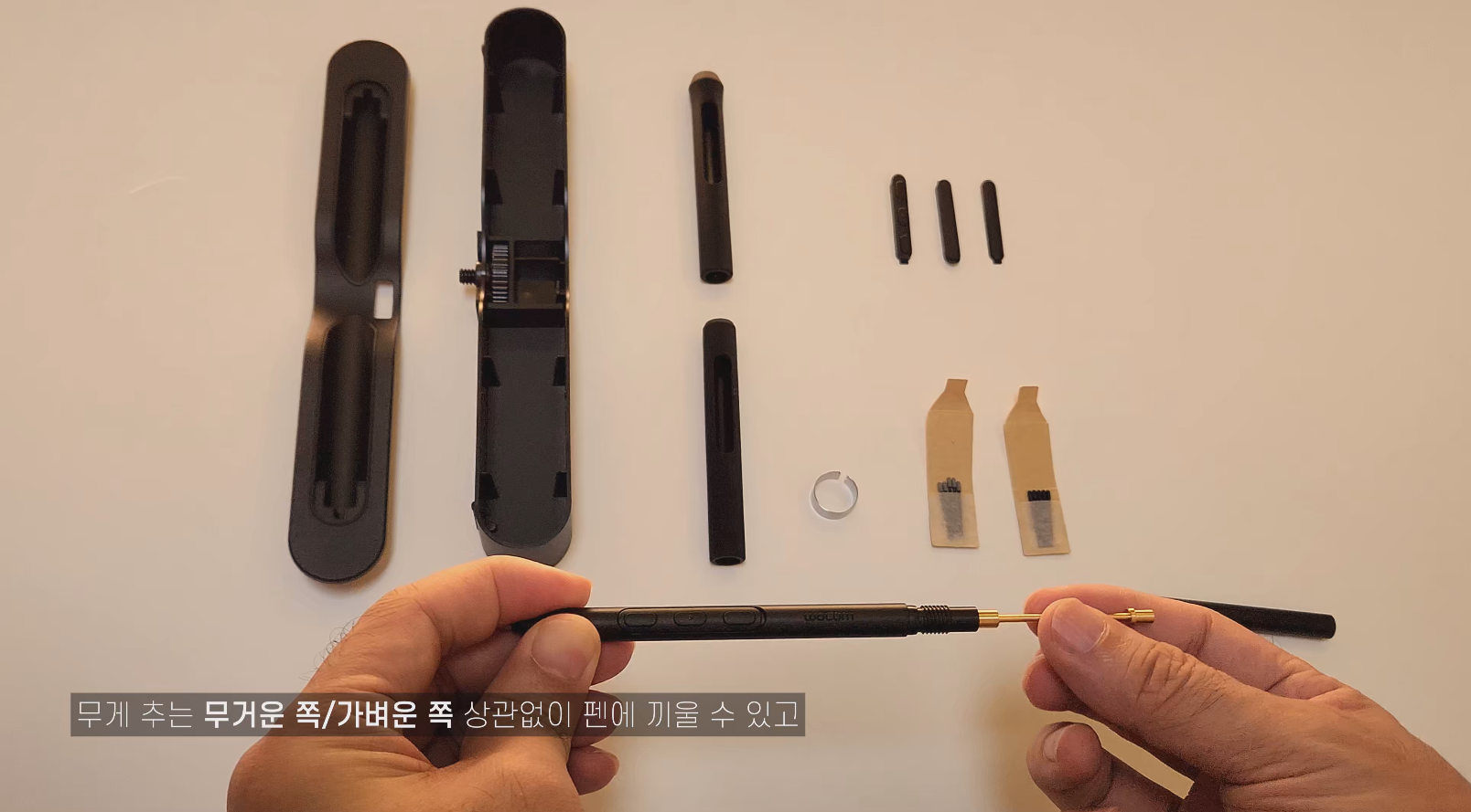 신티크 프로 27의 자랑, 와콤 프로 펜 3를 조립하는 과정입니다. 프로 펜 3의 하이라이트인 무게추는 위 사진과 같은 방식으로 펜 뒤쪽을 열어서 넣을 수 있습니다. 무거운 쪽과 가벼운 쪽 방향 상관 없이 취향에 맞게 넣을 수 있는데, 라이트박스님은 무게추의 무거운 쪽이 앞으로 오는 게 마음에 들었다고 하네요.