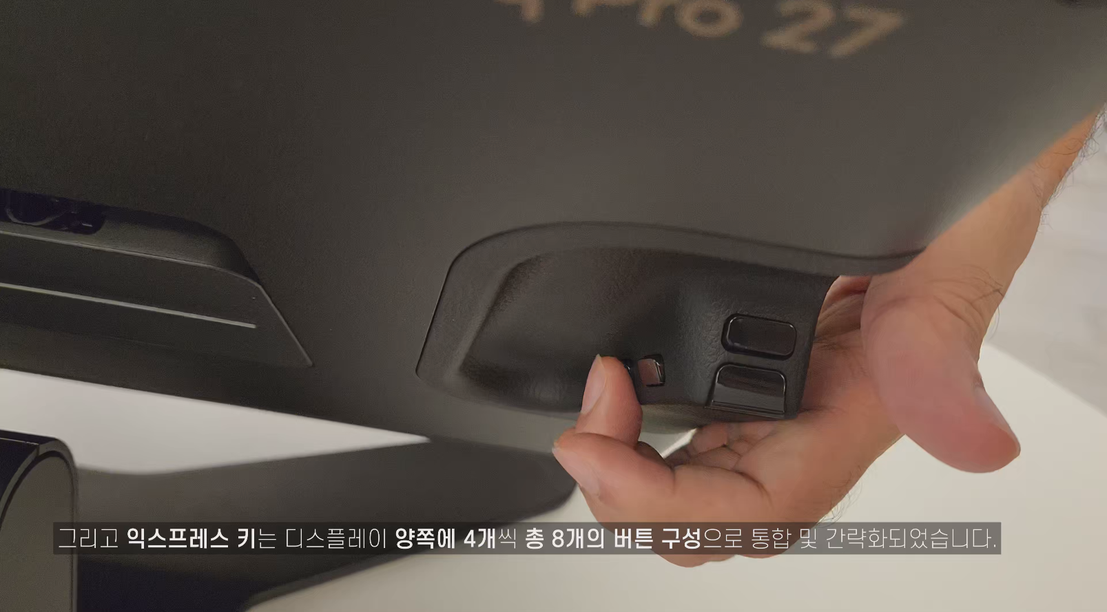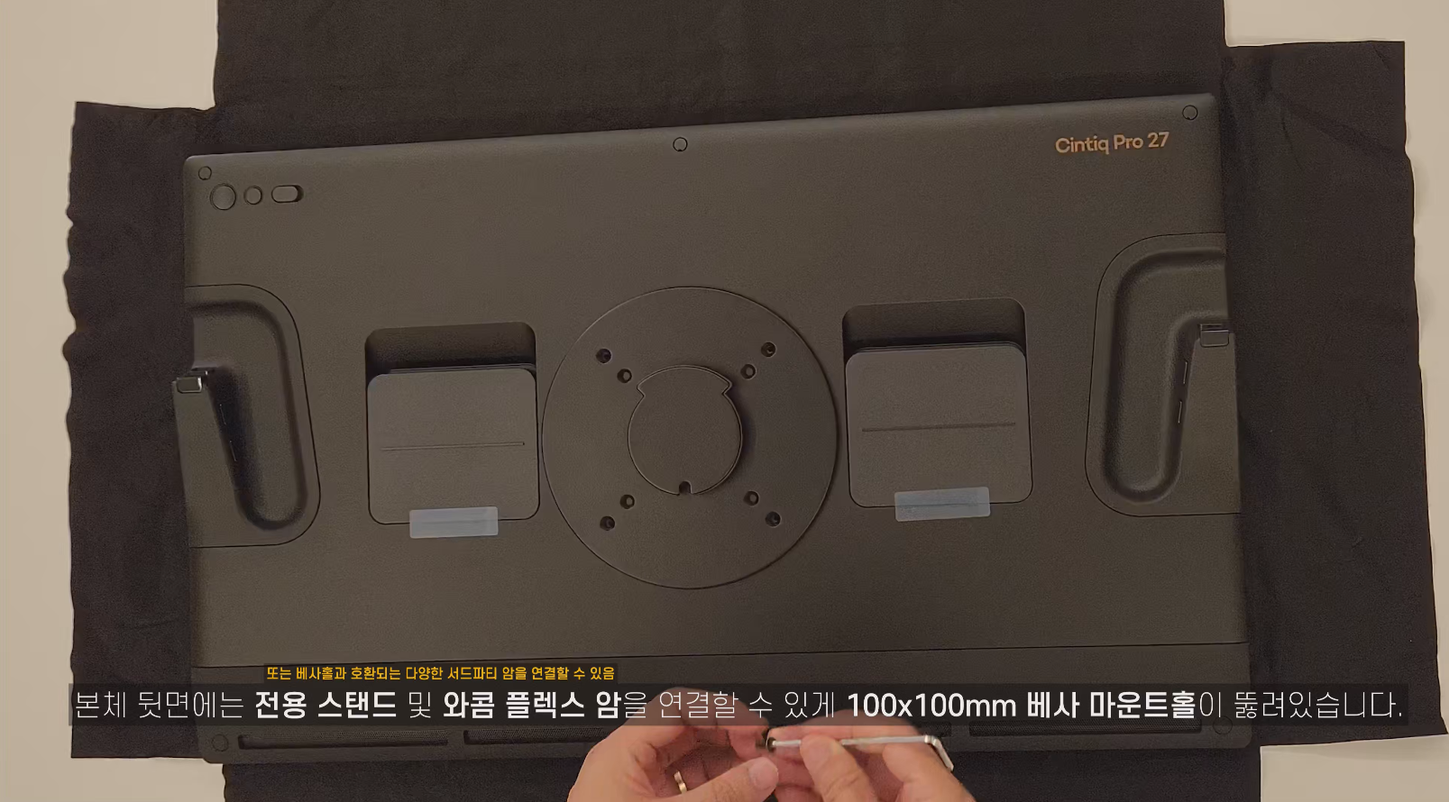 신티크 프로 27에 전용 스탠드 또는 플렉스 암을 연결할 수 있는 베사 마운트홀이 제품 뒷면에 탑재되어 있습니다. 베사홀에 연결되는 서드파티 제품을 사용할 수도 있고요.