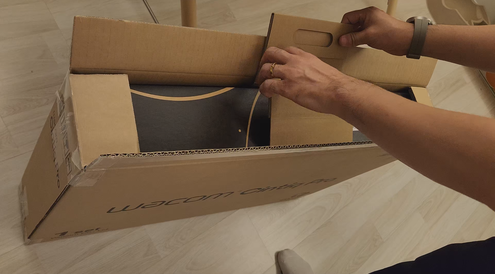 먼저 언박싱부터 함께 볼까요? 라이트박스님이 신티크프로 27 포장 박스에서 타블렛 본품을 꺼내는 모습인데, 유저들을 위한 와콤의 디테일을 확인할 수 있어요. 내용물의 위쪽에 운반 손잡이가 있어서 편하게 꺼낼 수 있습니다. 특히 이렇게 큰 박스는 박스를 뒤집어서 탈탈 털기에도 곤란하고, 그렇다고 박스 안에 손을 집어넣어서 꺼내기도 어렵거든요. 손잡이를 이용해서 타블렛이 든 상자를 쉽게 꺼내보세요!