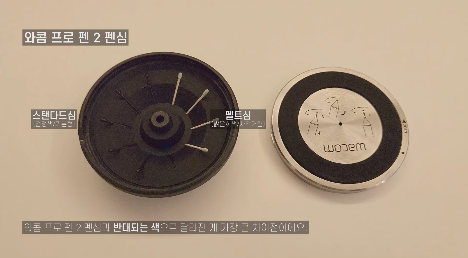 와콤 프로 펜 3은 펜심에서도 변화가 있었는데요, 기본 스탠다드심은 회색 컬러, 사각거리는 느낌이 특징인 펠트심은 검정색이에요. 프로 펜 2에서는 스탠다드심이 검정색이고, 펠트심이 회색이었던 것과 반대됩니다.