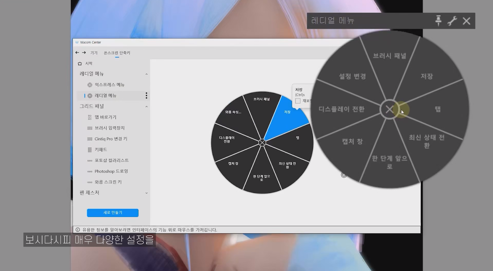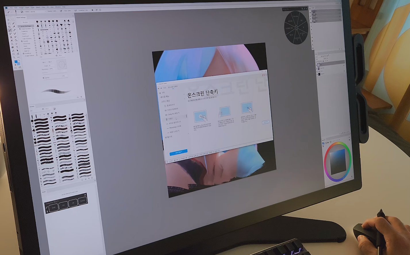 와콤 데스크탑 센터는 와콤 센터로 바뀌면서 대폭 업그레이드되었습니다. 신티크 프로 27에서는 와콤 센터를 이용해서 온스크린 단축키를 사용할 수 있는데, 화면 위에 있는 플로팅 상태의 익스프레스 키 리모컨이라고 보면 돼요. 레디얼 메뉴, 그리드 패널, 펜 제스처 등 보다 더 세밀한 작업을 위해 설정이 가능합니다. 그리고 화면 중에서도 단축키 그리드 패널만 터치가 되도록 설정하는 등 터치 오작동으로 인해 발생 가능한 불편함을 최대한 출이고자 노력했어요.
