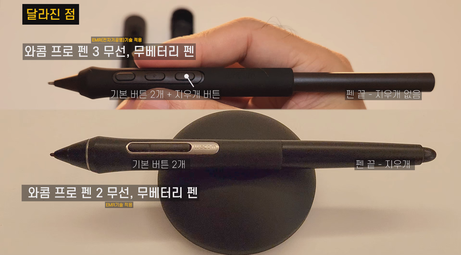두 펜 모두 전자기공명(EMR) 기술이 적용되어 연결 선 필요 없이 사용할 수 있는 무배터리 펜이라는 점은 같습니다. 필압도 8,192단계로 동일하고요. 단, 사이드 버튼의 개수와 펜 끝의 지우개 유무에서 차이가 있어요. 그리고 사이드 버튼을 자주 사용하지 않는 분이라면 얼마든지 버튼을 바꿔 끼워서 프로 펜 3의 사이드 버튼을 사용하지 않을 수 있어요.