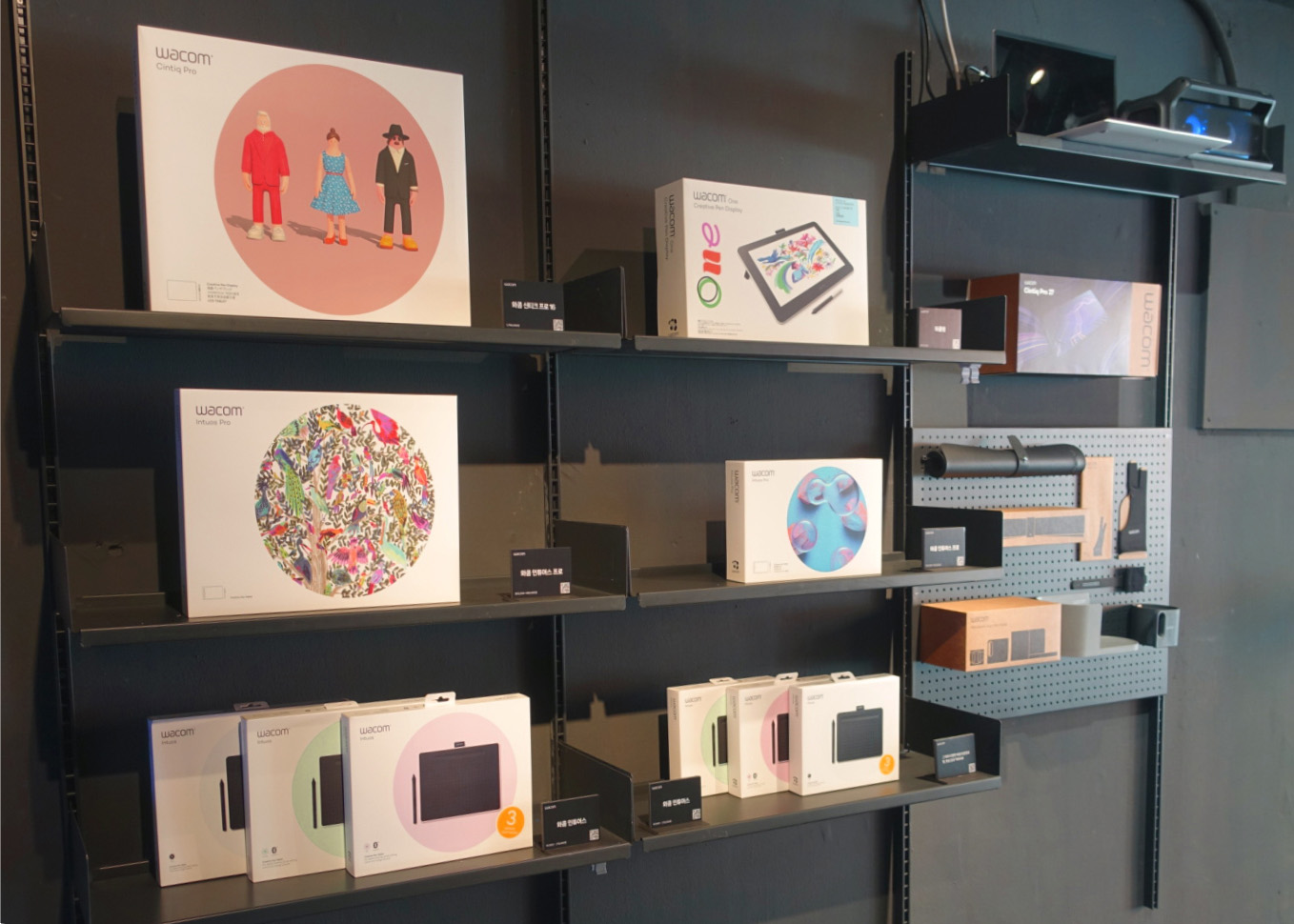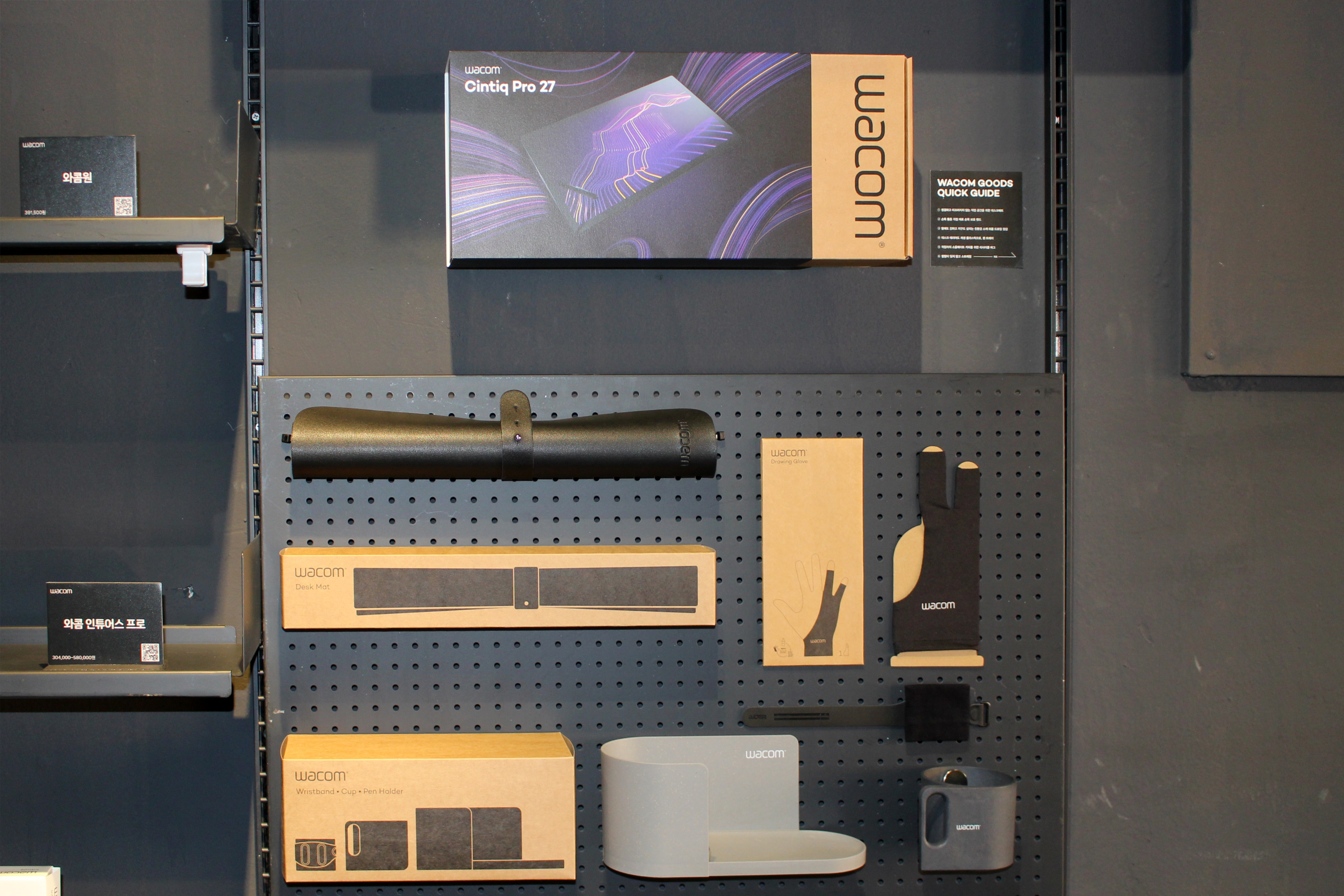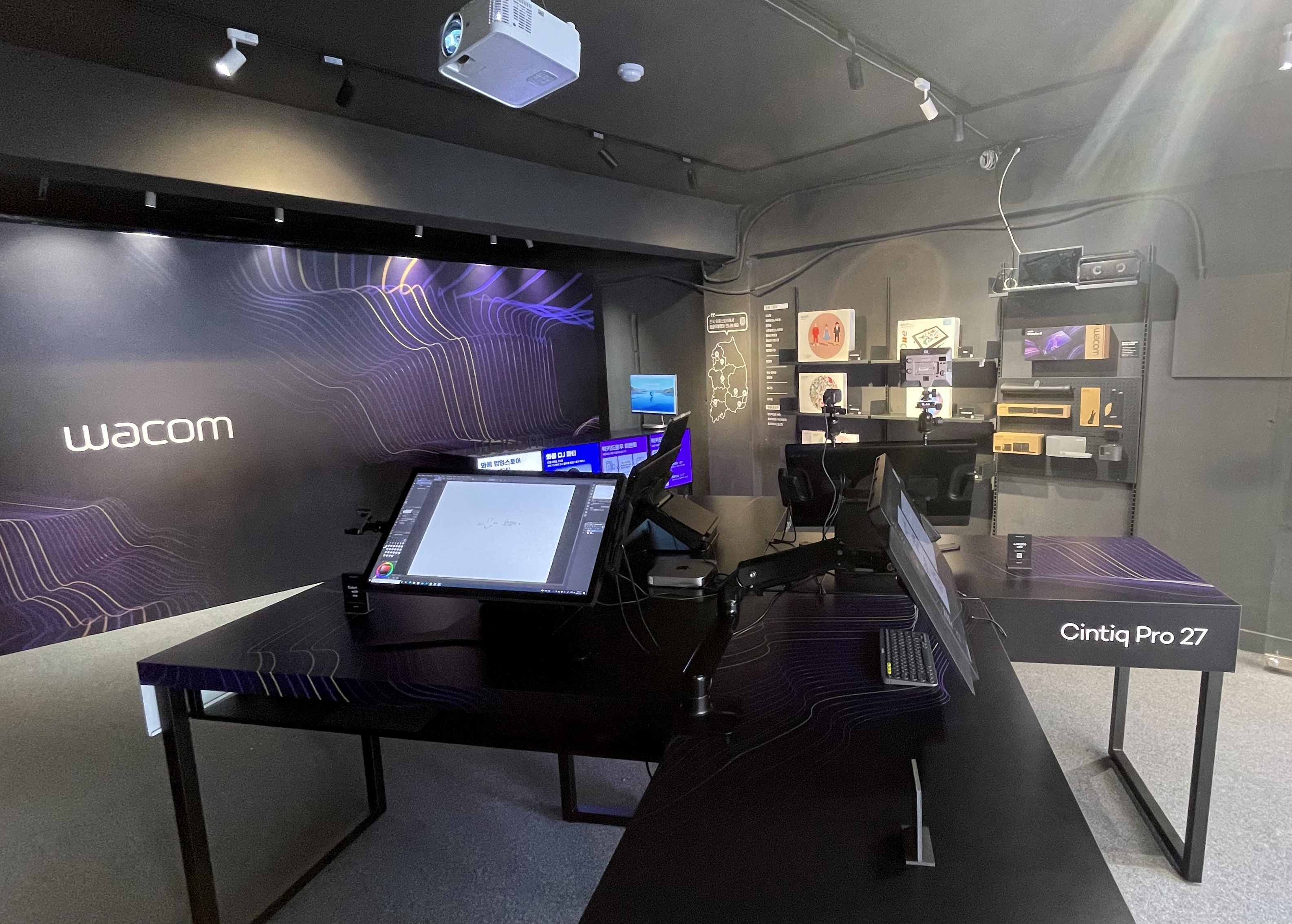 그리고 와콤 팝업스토어 현장에서는 와콤 신티크 프로 27 뿐만 아니라, 와콤의 다른 타블렛 라인업을 확인할 수 있었는데요, 신티크 프로 16, 와콤 원, 인튜어스 프로, 인튜어스 등 여러 모델이 진열되어 있었습니다. 진열된 타블렛 모두 입문자는 물론이고 취미로 창작 작업을 즐기는 아마추어와 전문가까지 폭넓은 사용자층을 자랑하는 모델이에요.