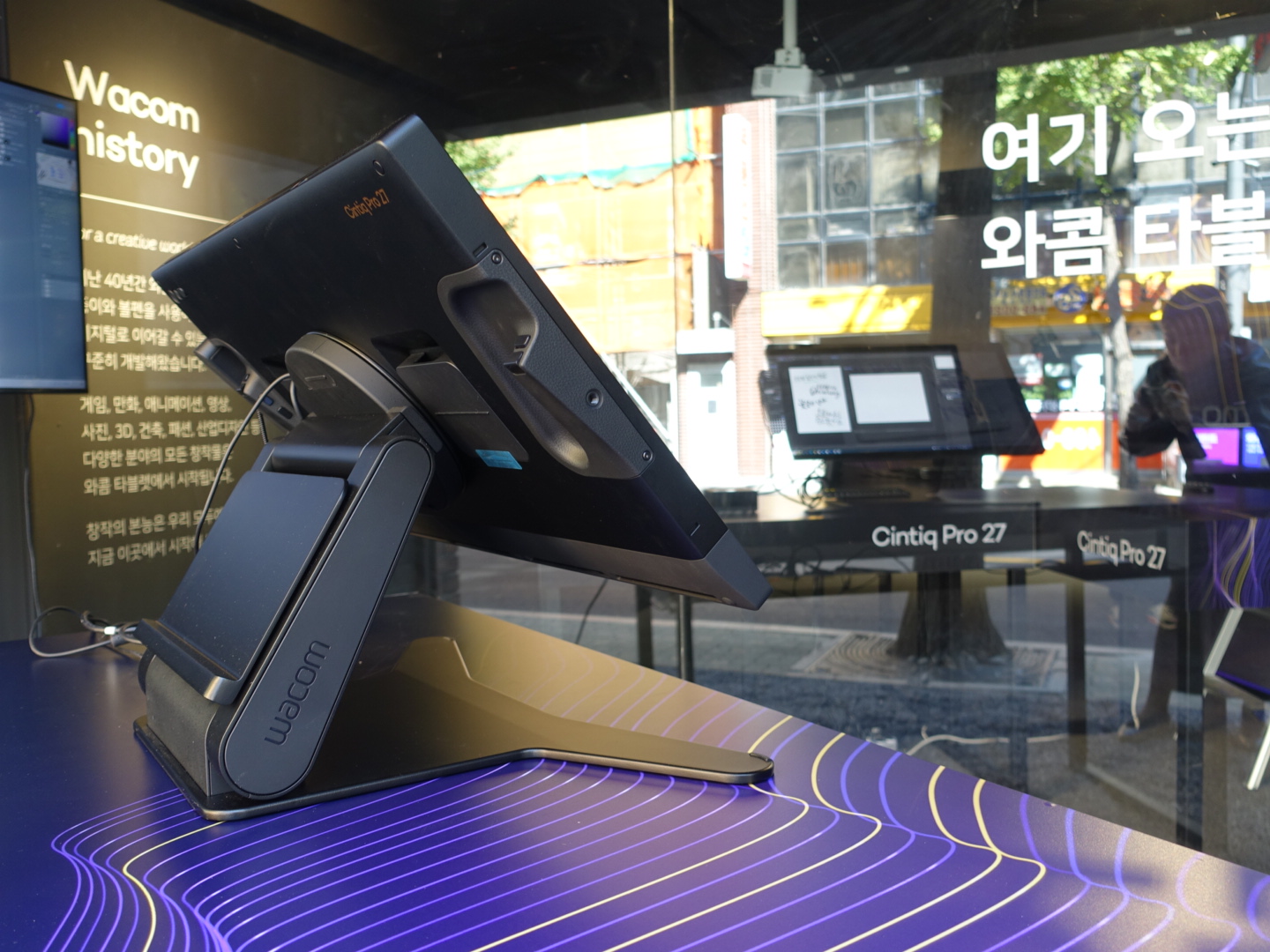 그럼 이제 팝업스토어 내부를 확인해볼까요? 들어가자마자 이번 팝업의 주인공인 신티크 프로 27이 보입니다. 얇아진 베젤과 깔끔한 디자인, 120Hz 주사율과 뛰어난 색 재현율, 빠른 반응속도를 자랑하는 디스플레이까지 전부 눈에 띄네요. 신티크 프로 27 전용 스탠드와 와콤 플렉스암에 거치되어 더욱 견고하고 안정적으로 방문객을 기다리고 있는 모습입니다.