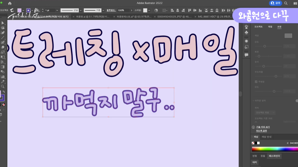 작성한 글씨는 일러스트레이터에서 설정을 바꾸어 색상을 변경하고 테두리를 추가해주었어요. 특히 이런 글씨 테두리는 실제 펜으로는 하기 어려운 것들이지만, 타블렛을 사용하면 아주 깔끔하게 글씨에 테두리를 추가할 수 있답니다!