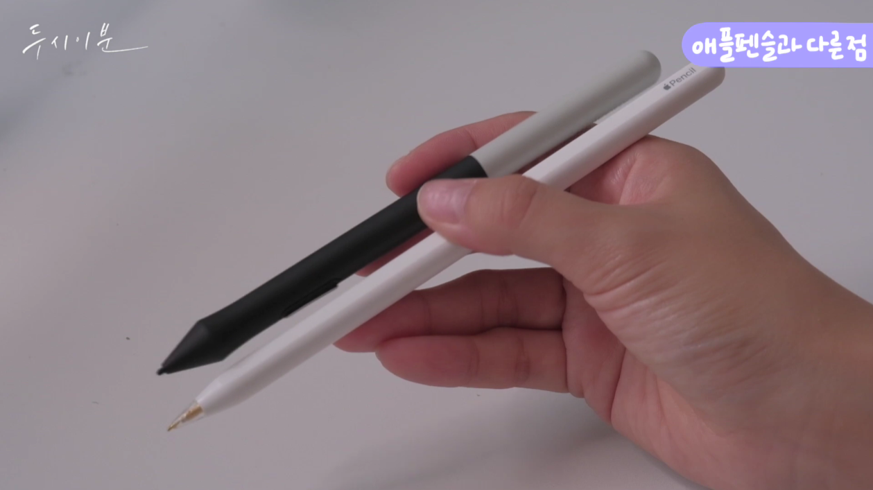 애플펜슬과 비교해보니, 두께 차이가 눈에 들어오네요. 와콤 원 펜은 인체공학적으로 디자인되어 그립감 또한 뛰어나요. 펜을 쥐면 미끄럽지 않으면서 단단하게 손가락 사이에 잡히는 느낌이 정말 좋답니다. 두시이분님에 따르면, 와콤 원 펜을 오래 사용해도 손이 피로하지 않았다고 해요.