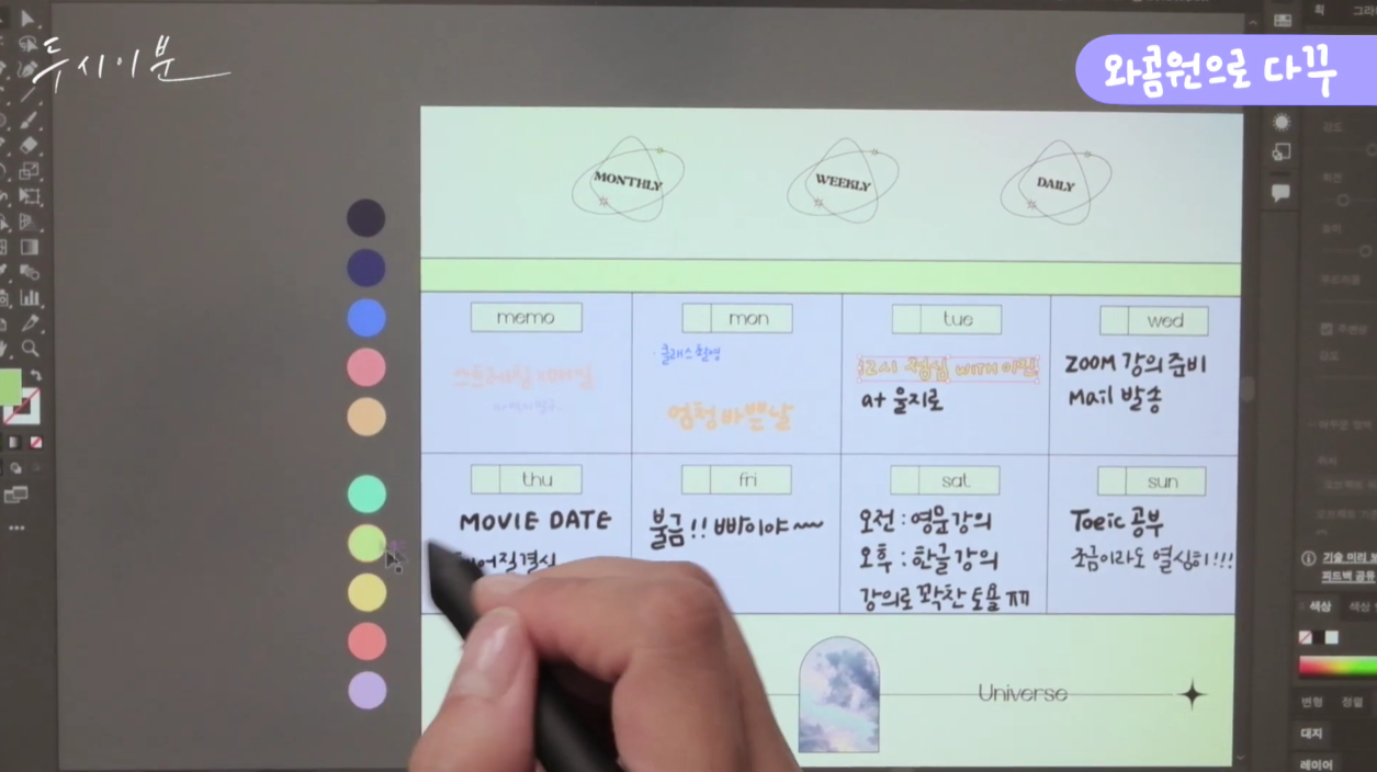 디지털 캘리그라피에 이어 디지털 다꾸를 소개하겠습니다. 디지털 다꾸족이 증가하면서 활용 가능한 다양한 다이어리 콘텐츠가 등장하고 있는데요, 두시이분님이 꾸민 다이어리는 깔끔하면서도 색 조합이 정말 예쁜 다이어리네요. 다이어리도 이제 재밌고 편하게 타블렛으로 즐겨보세요.
