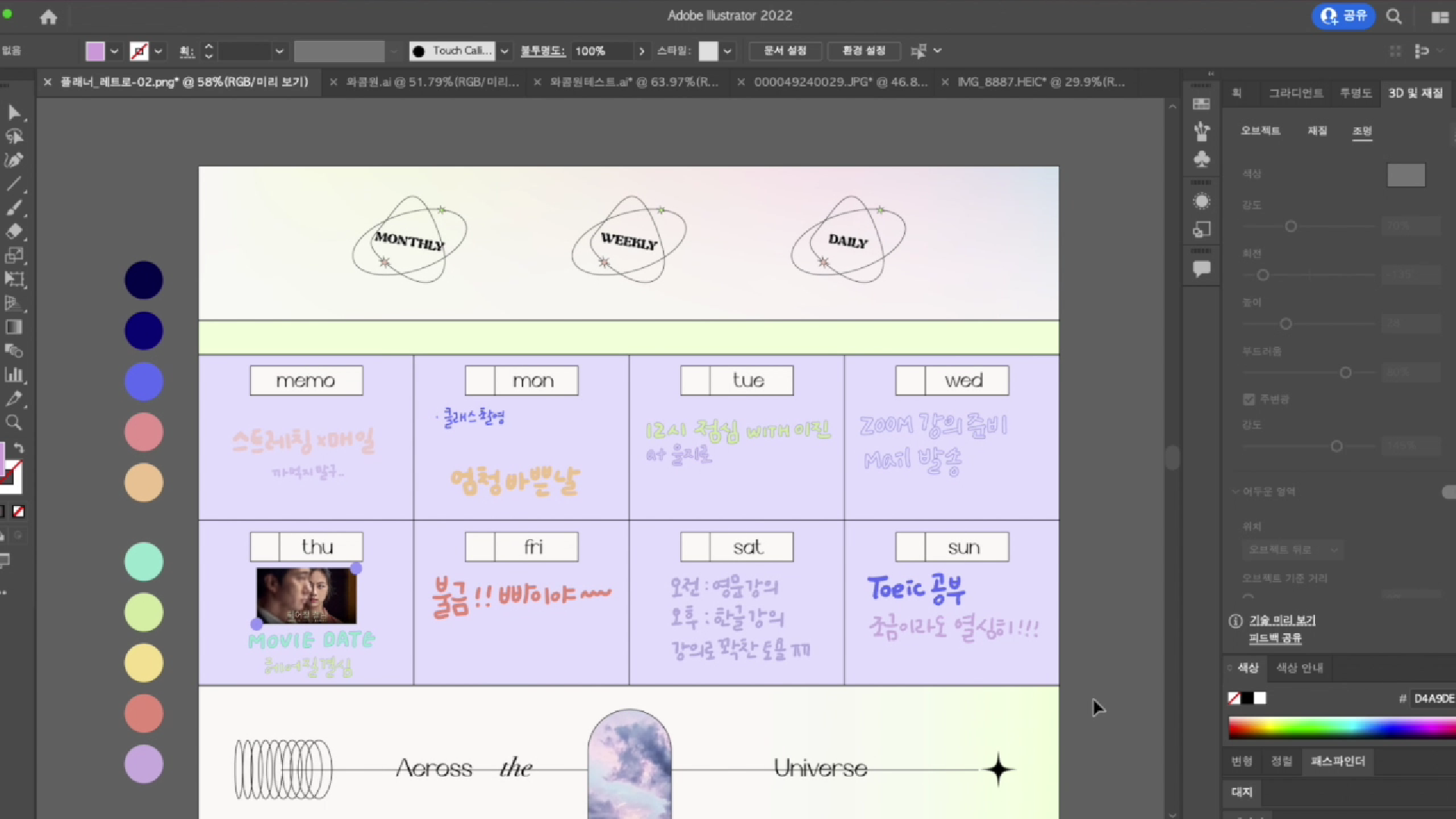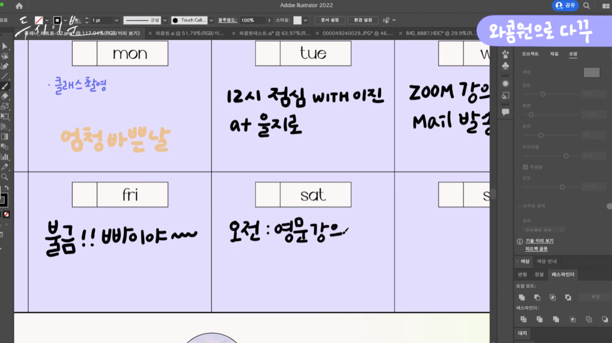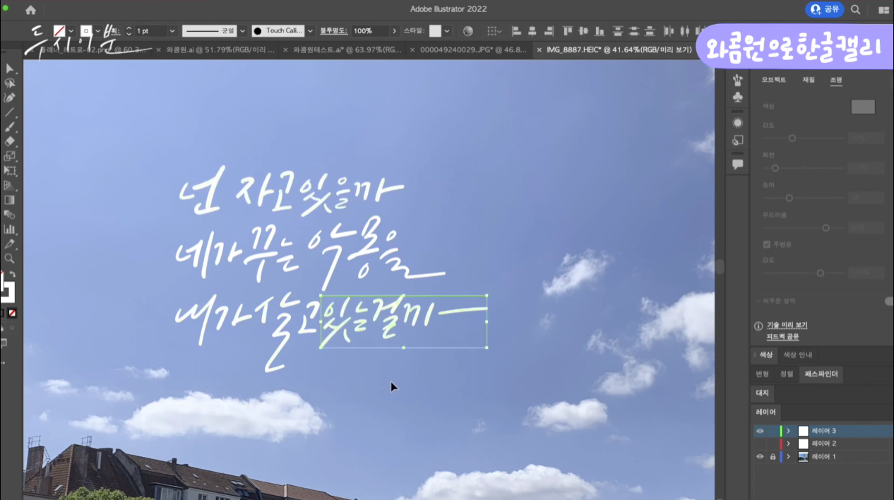 작성한 글씨는 일러스트레이터에서 설정을 바꾸어 색상을 변경하고 테두리를 추가해주었어요. 특히 이런 글씨 테두리는 실제 펜으로는 하기 어려운 것들이지만, 타블렛을 사용하면 아주 깔끔하게 글씨에 테두리를 추가할 수 있답니다!