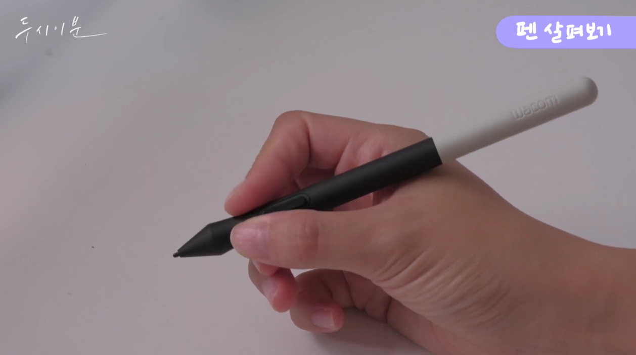 와콤 원과 함께 사용하는 디지털 펜, 와콤 원입니다. 와콤 원은 4,096단계의 필압 인식은 물론이고 60도의 기울기까지 지원하는 펜인데요, 배터리가 내장되어 있지 않아서 충전할 필요 없이 언제든 사용할 수 있다는 장점이 있어요. 사이드 버튼도 달려 있어 단축키 등을 설정할 수도 있답니다.