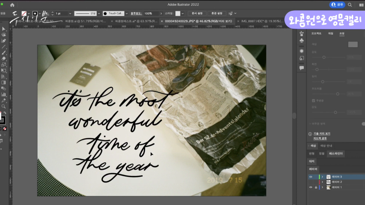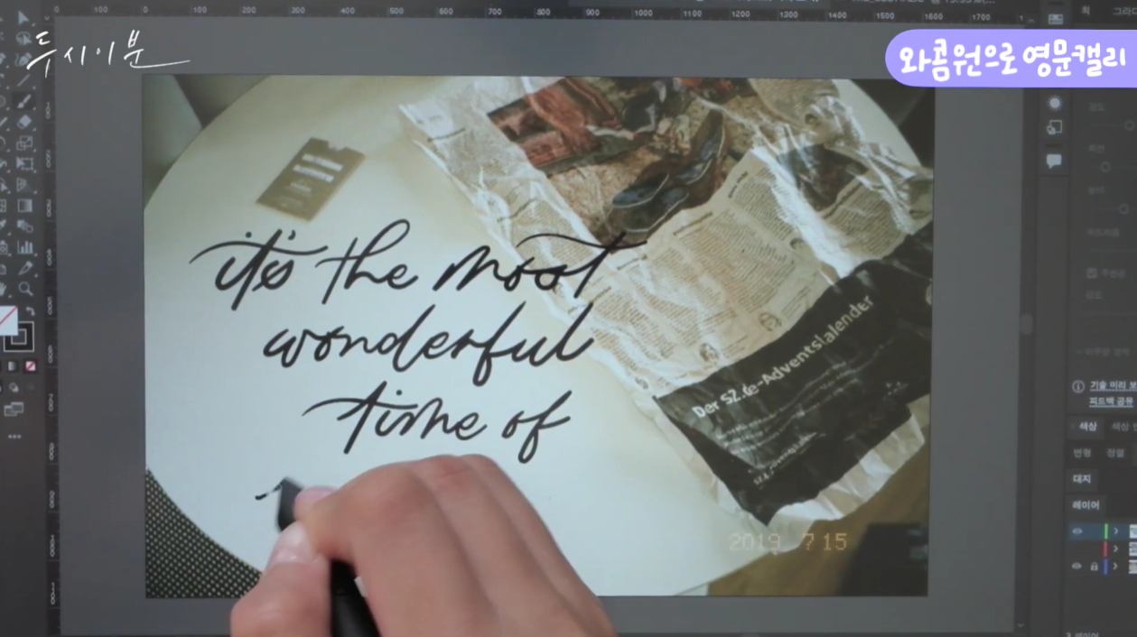 리뷰 영상에는 두시이분님이 어도비 일러스트레이터를 활용해 캘리그라피 하는 모습이 담겨 있습니다. 사진 위에 부드럽게 영문 캘리 작업을 하셨는데요, 실제 펜과 종이를 사용하는 것과 다르게 글씨가 마음에 들지 않으면 바로바로 되돌리거나 수정할 수 있다는 점이 좋습니다. 단축키를 사용할 수 있는 것도 좋고요.
