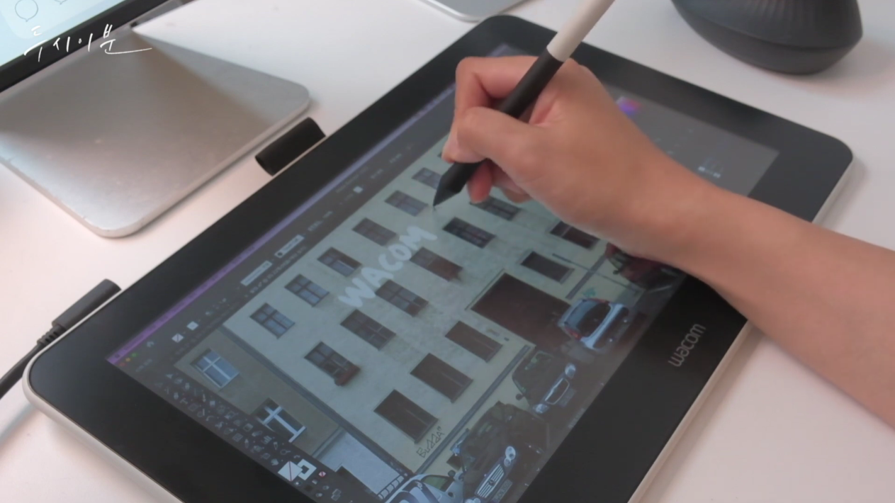 먼저 와콤 원의 외관을 살펴볼게요. 와콤 원은 13형 디스플레이가 탑재된 액정타블렛으로, 콤팩트한 크기 덕분에 책상 크기를 많이 차지하지 않습니다. 위 사진은 와콤 원을 PC에 연결한 모습인데요, 두시이분님은 전원 버튼, 펜을 보관할 수 있는 홀더, 전원 케이블 등이 전부 제품 상단에 있어서 편리했다고 해요. 실제로 제품 이곳저곳에 연결 포트와 버튼이 있으면 괜히 잘못 누를까봐 걱정이 되는데, 와콤 원은 이런 부분에서 자유로워요.