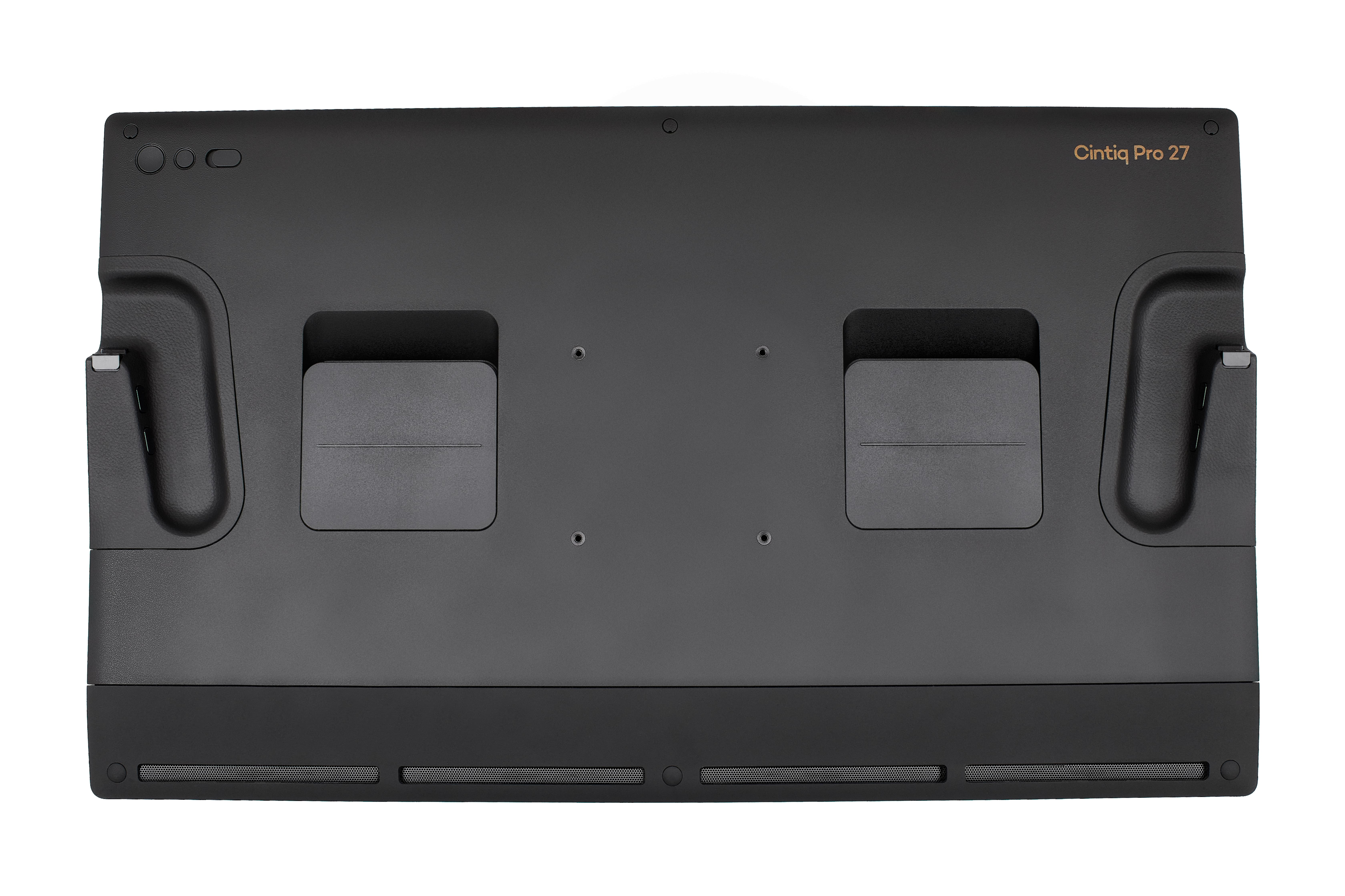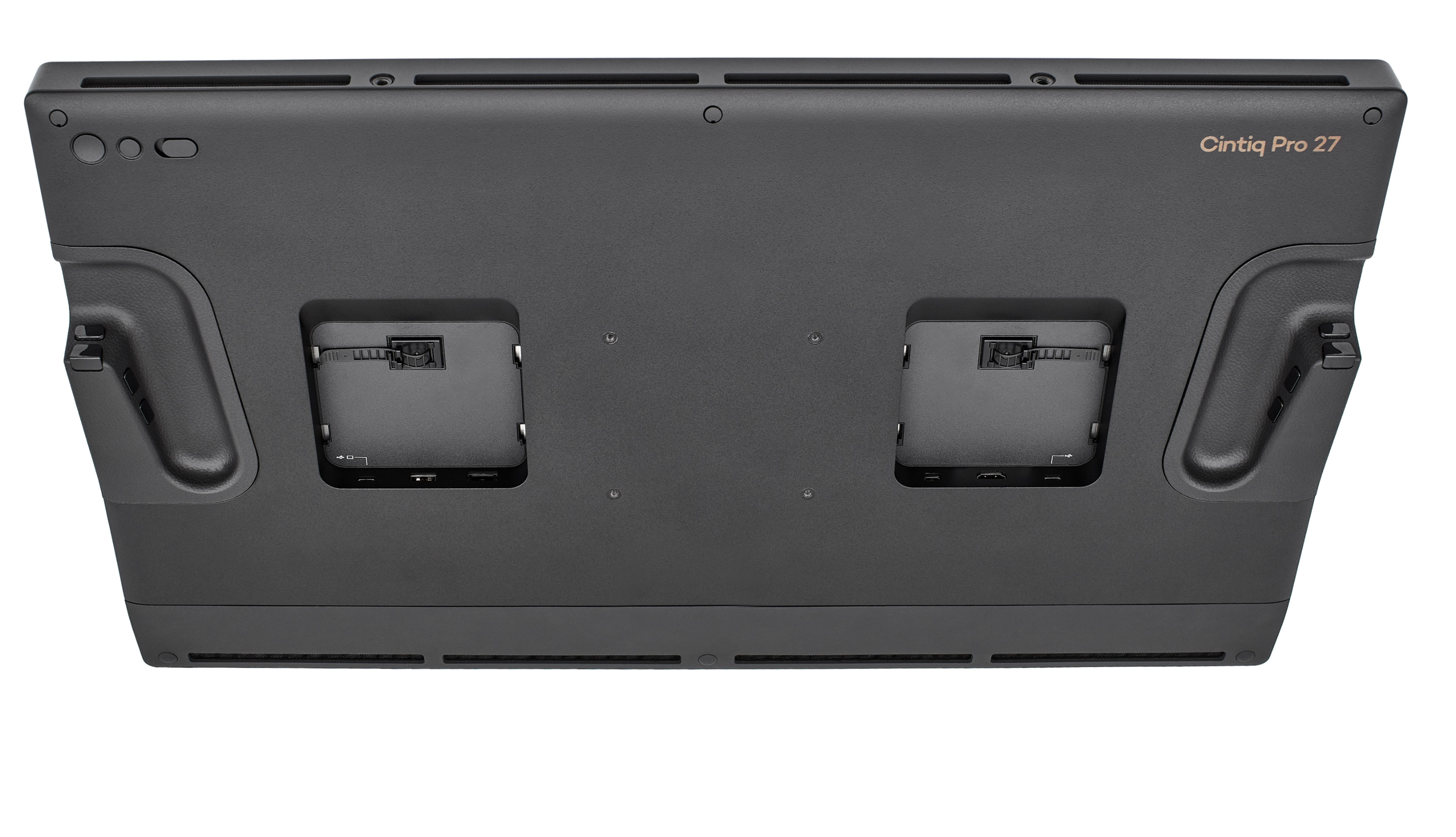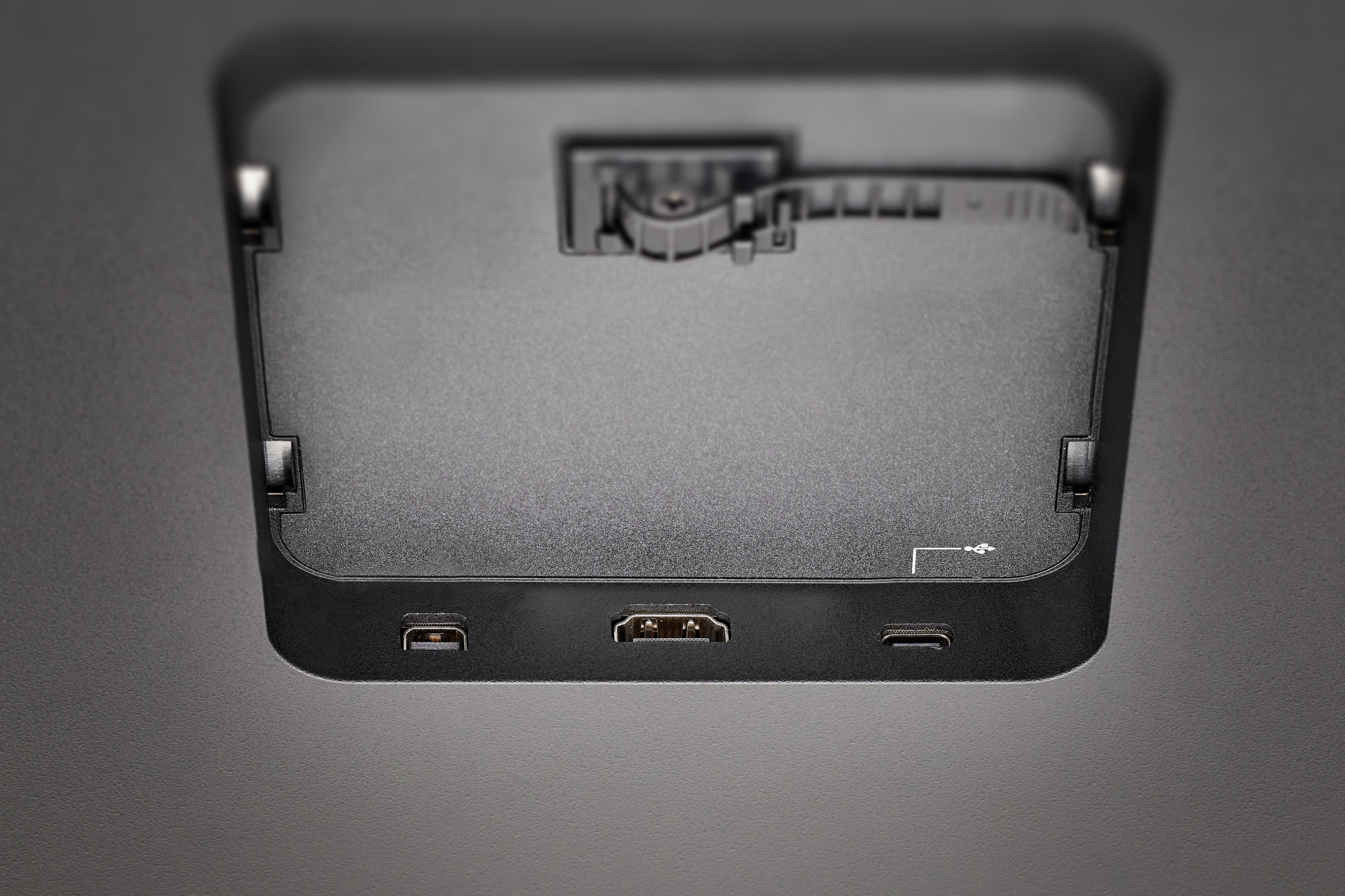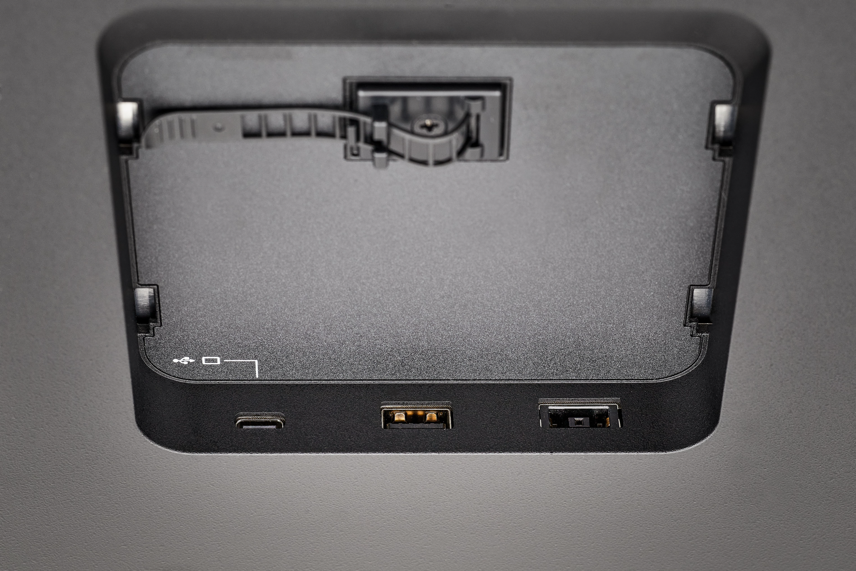 연결 케이블을 모두 살펴봤으니 신티크 프로 27에 탑재된 포트도 살펴봅시다. 위 이미지는 신티크 프로 27의 뒷면인데요, 양쪽에 하나씩 있는 두 개의 네모가 보이시나요? 바로 포트가 여기 숨겨져 있어요. 끼워진 플랩을 위로 올려서 빼주면, 포트가 등장합니다.