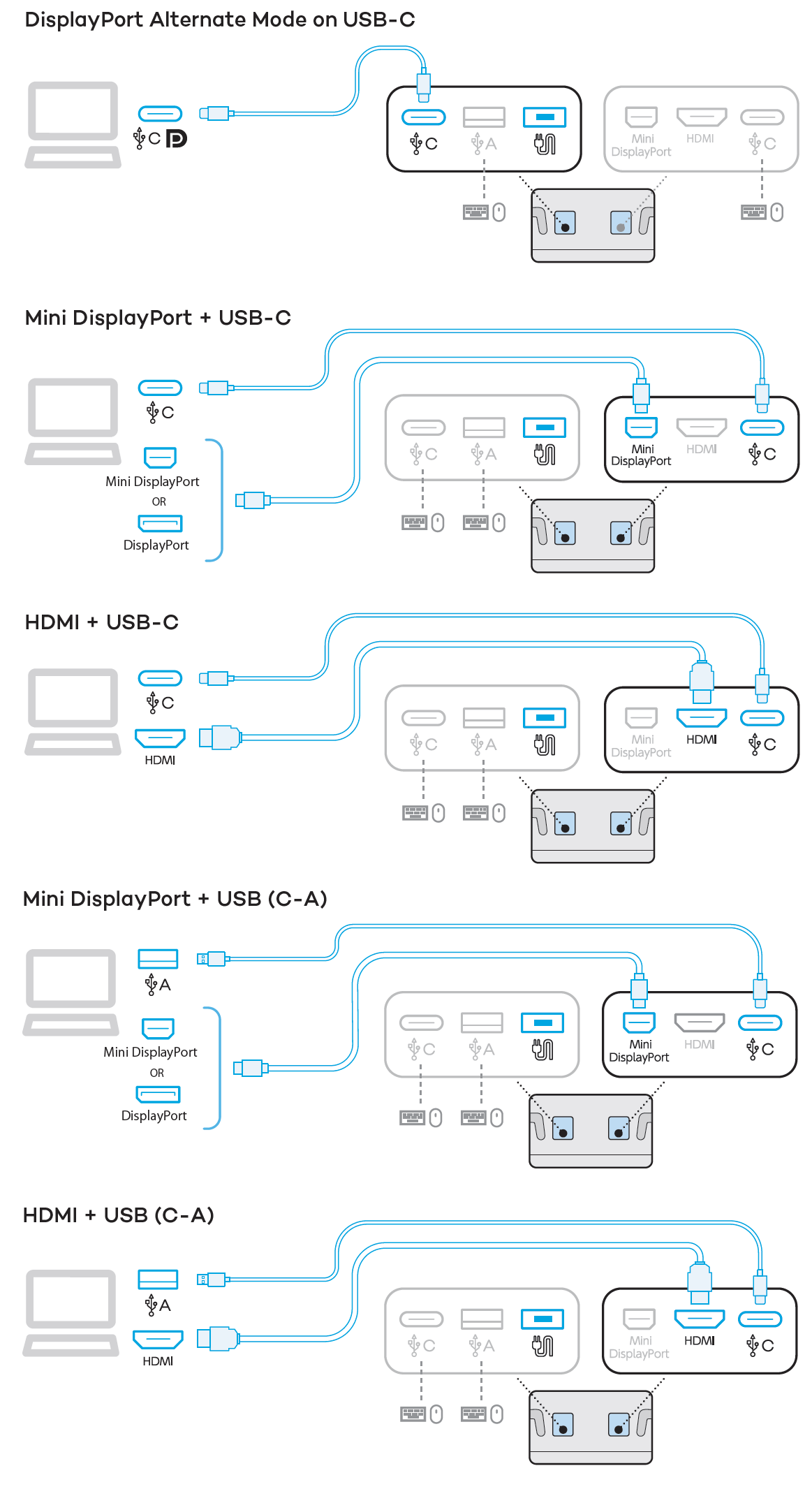 USB-C to USB-A 케이블이나 USB-C to USB-C 케이블을 연결해서 사용할 때는, 꼭 이 위치의 HDMI 단자가 있는 곳의 포트를 사용해주세요. DisplayPort Alt mode를 지원하는 USB-C 단자가 있는 PC와 연결한다면 아래 이미지를 참고해서 연결해주면 됩니다.