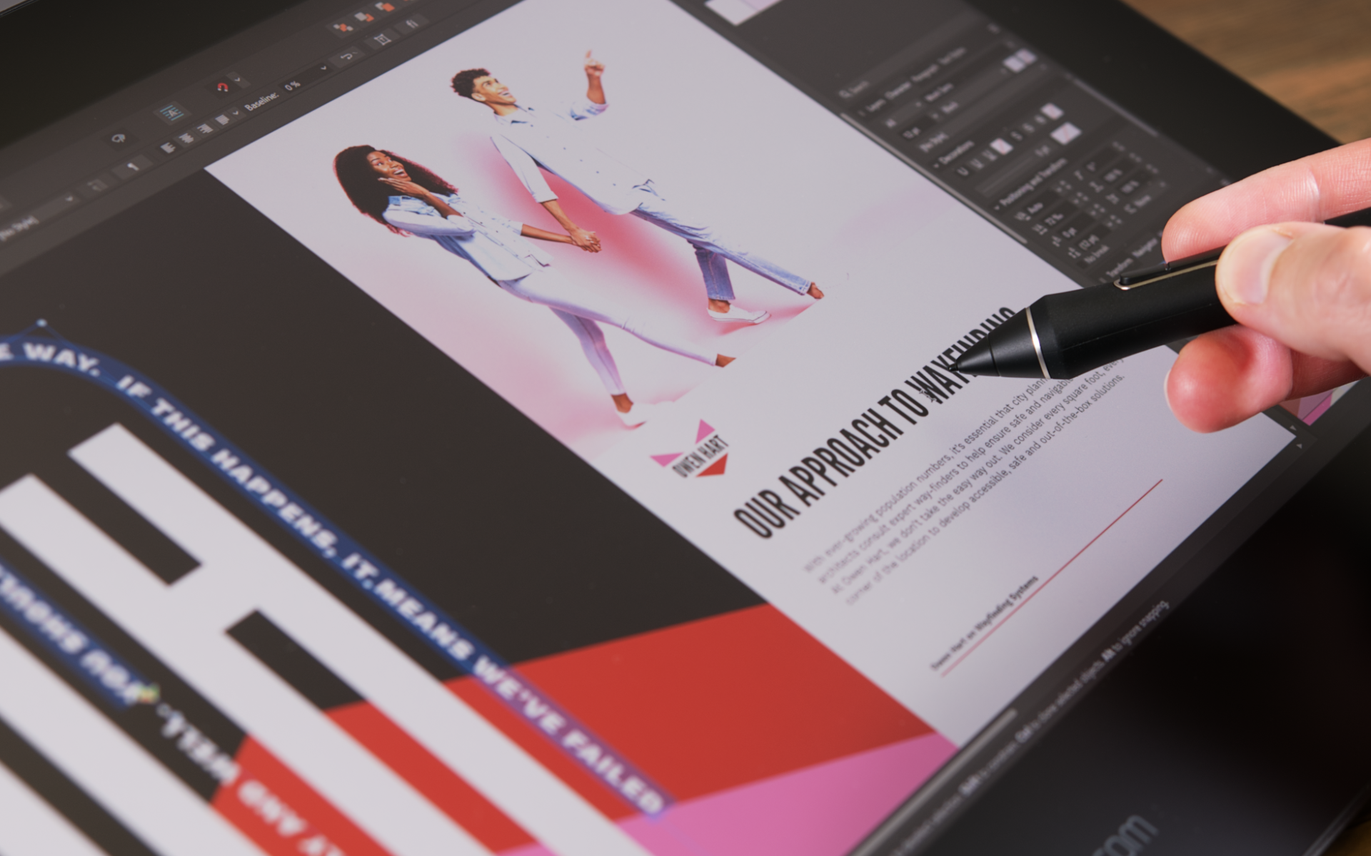 와콤 타블렛의 디지털 펜을 사용해 작업물에 래스터 브러쉬 텍스처를 추가하고, 아이콘의 픽셀 하나하나를 정교하게 편집하고, 선명한 벡터에 그레인을 추가할 수 있습니다. 창의적인 자율성을 진정 실현할 수 있게 된 것이지요! 다양한 타이포그래피 옵션을 제공해서 패스를 따라 텍스트가 위치하게 하거나, 나만의 커스텀 타이포를 만들 수도 있어요.
