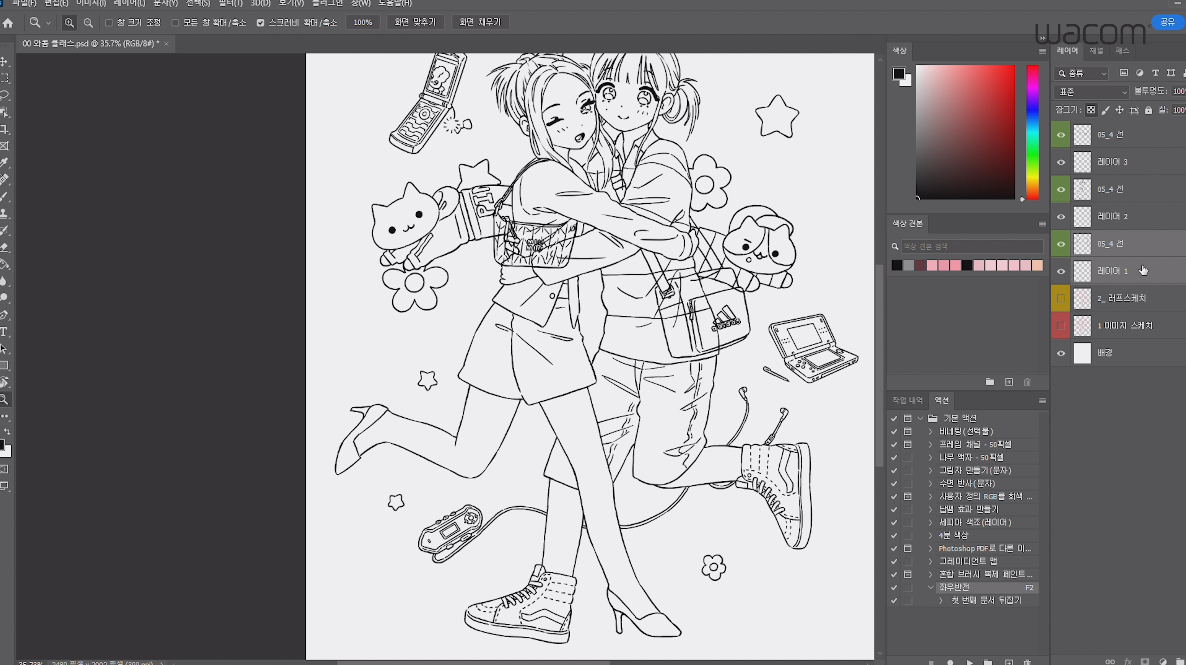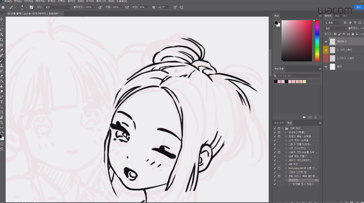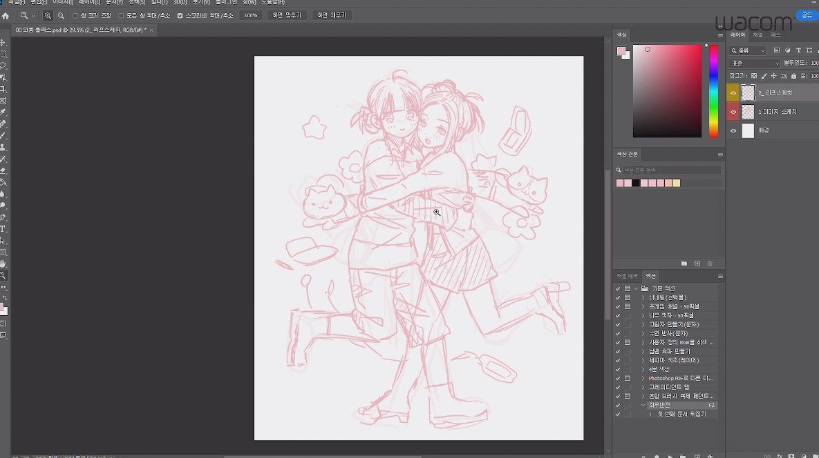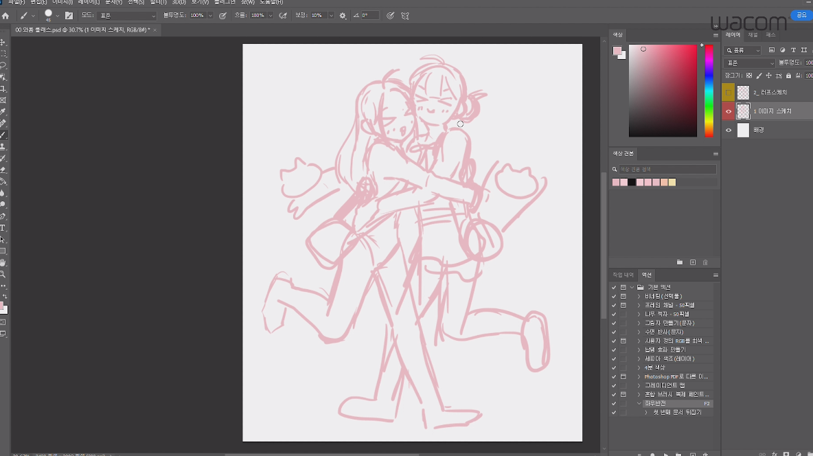 좌우반전을 해가면서 체크하면 그림이 한쪽에 치우쳐서 어색한지 파악할 수 있어서 좋아요. 작가님은 좌우반전을 포토샵 액션 키로 등록해서 수시로 사용한다고 합니다.