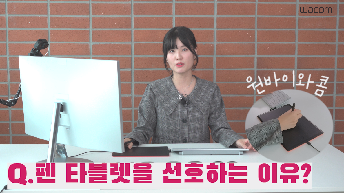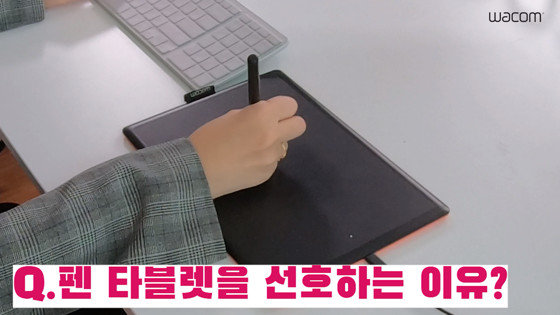 작가님이 사용하는 타블렛은 원바이와콤 중형 모델입니다. 원바이와콤은 펜타블렛인데요, 펜타블렛은 네모난 기기 위에 펜을 이용해 작업하고, 액정이 별도로 달려있지 않기 때문에 얇고 가벼워서 이동하기 용이하다는 장점이 있어요. 구리밍 작가님은 화면의 전체적인 비율을 매우 중요하게 생각하는데, 펜타블렛을 이용해서 타인이 처음 보는 시선으로 자신의 작품을 보면서 작업하는 것을 선호한다고 합니다. 또, 펜타블렛을 사용하면 바른 자세로 화면을 보고 작업할 수 있기 때문에, 허리나 목에 무리가 가지 않는 점 역시 마음에 든다고 해요.