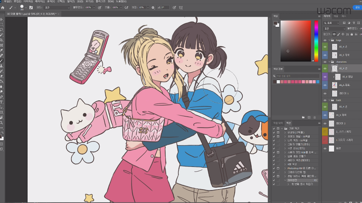 이제 본격적으로 채색 작업에 들어갑니다. 작가님은 명암을 많이 넣기보단 간단한 피부톤 명암과 맑은 색을 이용해서 채색하는 편인데요, 기존에 작업한 이미지를 불러와 놓고, 자주 사용하는 색을 스포이드로 뽑아서 칠하는 방법도 추천합니다. 서로 다른 색을 칠했음에도 컬러의 강약 조절이 잘 되지 않는다면, 채도를 뺀 상태에서 비교해 본 후 다시 작업하는 방법도 좋아요.