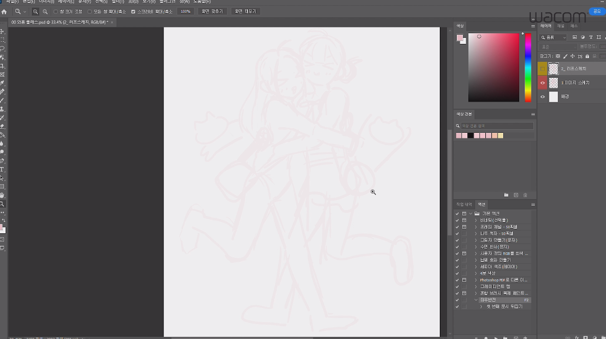원래 작업한 이미지 스케치의 투명도를 낮춰줍니다. 선이 많이 겹쳐질 수록 이미 작업한 레이어와 지금 작업 중인 레이어가 섞일 수 있기 때문에, 아래에 있는 레이어는 최대한 투명도를 낮춰주세요.