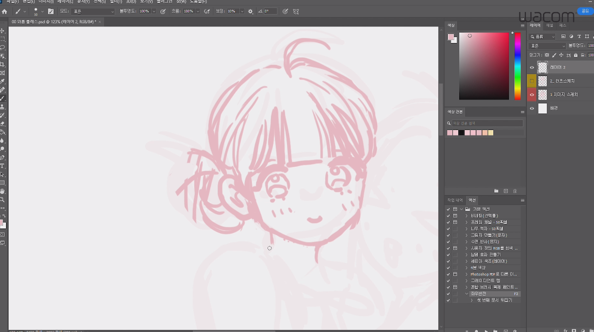 이미지 스케치 단계에서는 브러쉬 컬러를 매우 얕은 색으로 설정해주세요. 브러쉬 종류는 기본 브러쉬입니다. 기본 브러쉬로도 다양한 느낌을 낼 수 있기 때문에, 브러쉬 종류에 연연하지 않아도 됩니다. 이미지 스케치할 때는 필압을 약하게 하는 게 포인트인데, 와콤 타블렛은 필압 조절이 자유롭기 때문에 이런 스케치 단계에도 적합한 기기입니다. 어느 부분에 무엇을 위치하면 좋을지 간략하게 표시하면서 그림을 그려주세요.