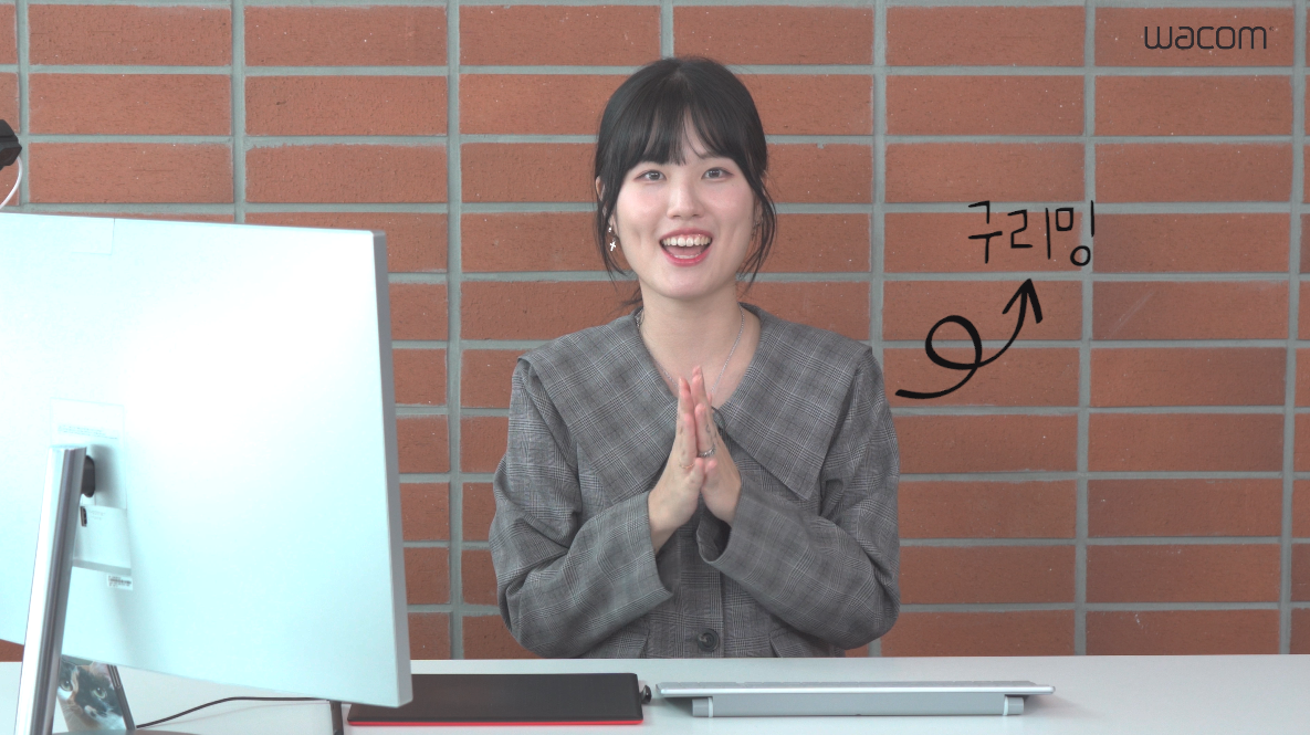 작가님이 사용하는 타블렛은 원바이와콤 중형 모델입니다. 원바이와콤은 펜타블렛인데요, 펜타블렛은 네모난 기기 위에 펜을 이용해 작업하고, 액정이 별도로 달려있지 않기 때문에 얇고 가벼워서 이동하기 용이하다는 장점이 있어요. 구리밍 작가님은 화면의 전체적인 비율을 매우 중요하게 생각하는데, 펜타블렛을 이용해서 타인이 처음 보는 시선으로 자신의 작품을 보면서 작업하는 것을 선호한다고 합니다. 또, 펜타블렛을 사용하면 바른 자세로 화면을 보고 작업할 수 있기 때문에, 허리나 목에 무리가 가지 않는 점 역시 마음에 든다고 해요.
