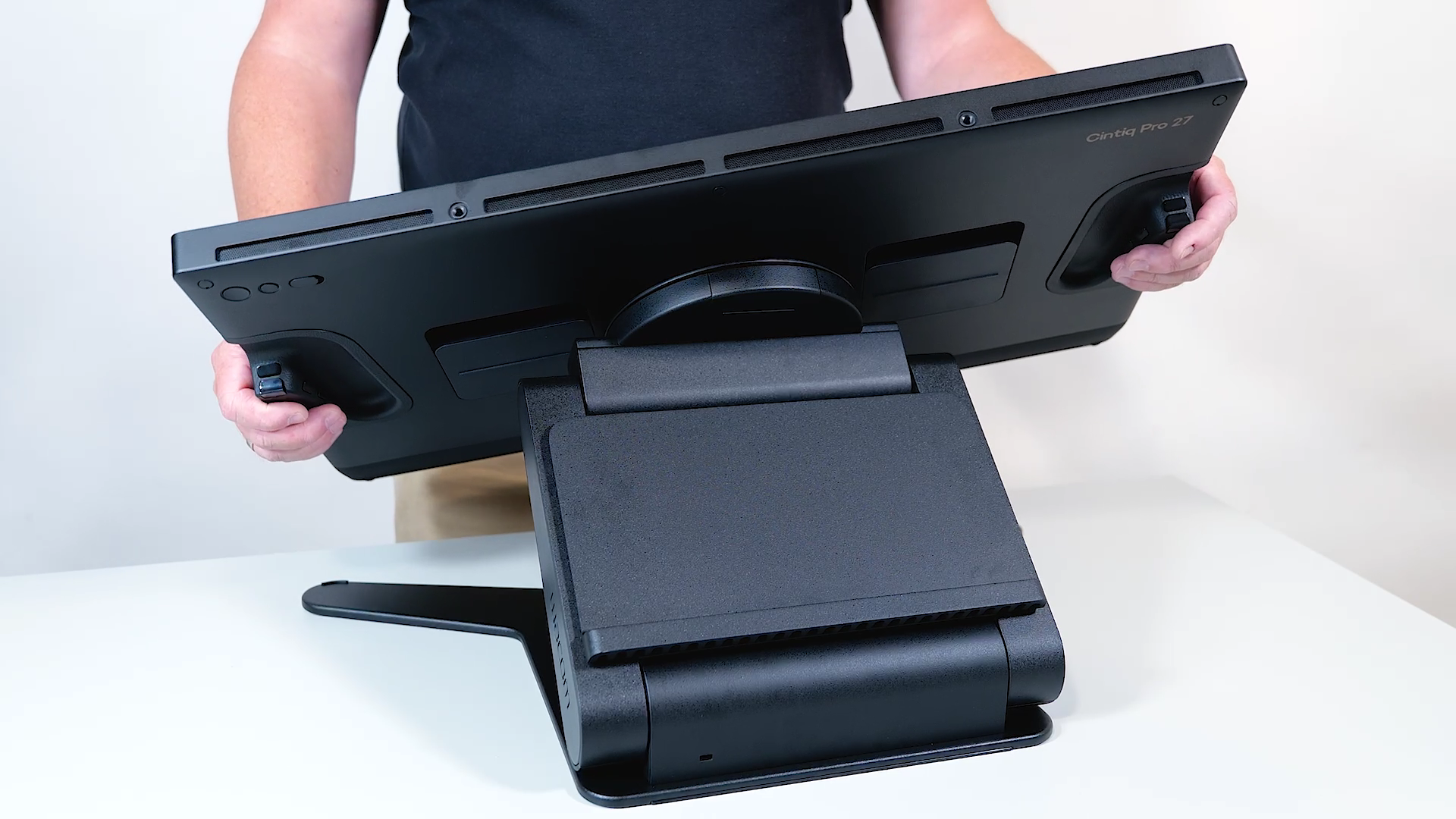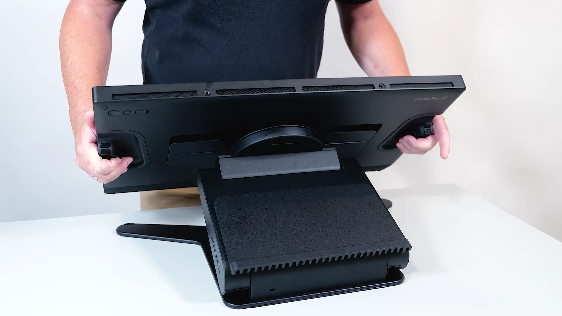 신티크 프로 27을 스탠드에 거치하기 위해서는 기기 뒷면에 피벗 플레이트가 부착되어야 합니다. 평평한 책상 위에 부드러운 천을 깔고 기기를 뒤집어 올려주세요. 절대로 책상 위에 타블렛 디스플레이를 바로 닿게 하지 말고, 반드시 부드러운 천 등의 깔개를 놓은 후 뒤집어야 합니다.
