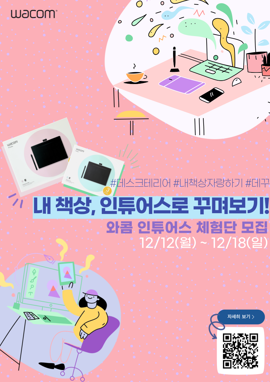 타블렛 하면 와콤, 펜타블렛 하면 인튜어스! 와콤이 펜타블렛 인튜어스 리뷰 체험단을 모집합니다. 내 책상을 인튜어스로 멋지게 꾸미고 리뷰를 남길 10명의 체험단을 기다리고 있어요.