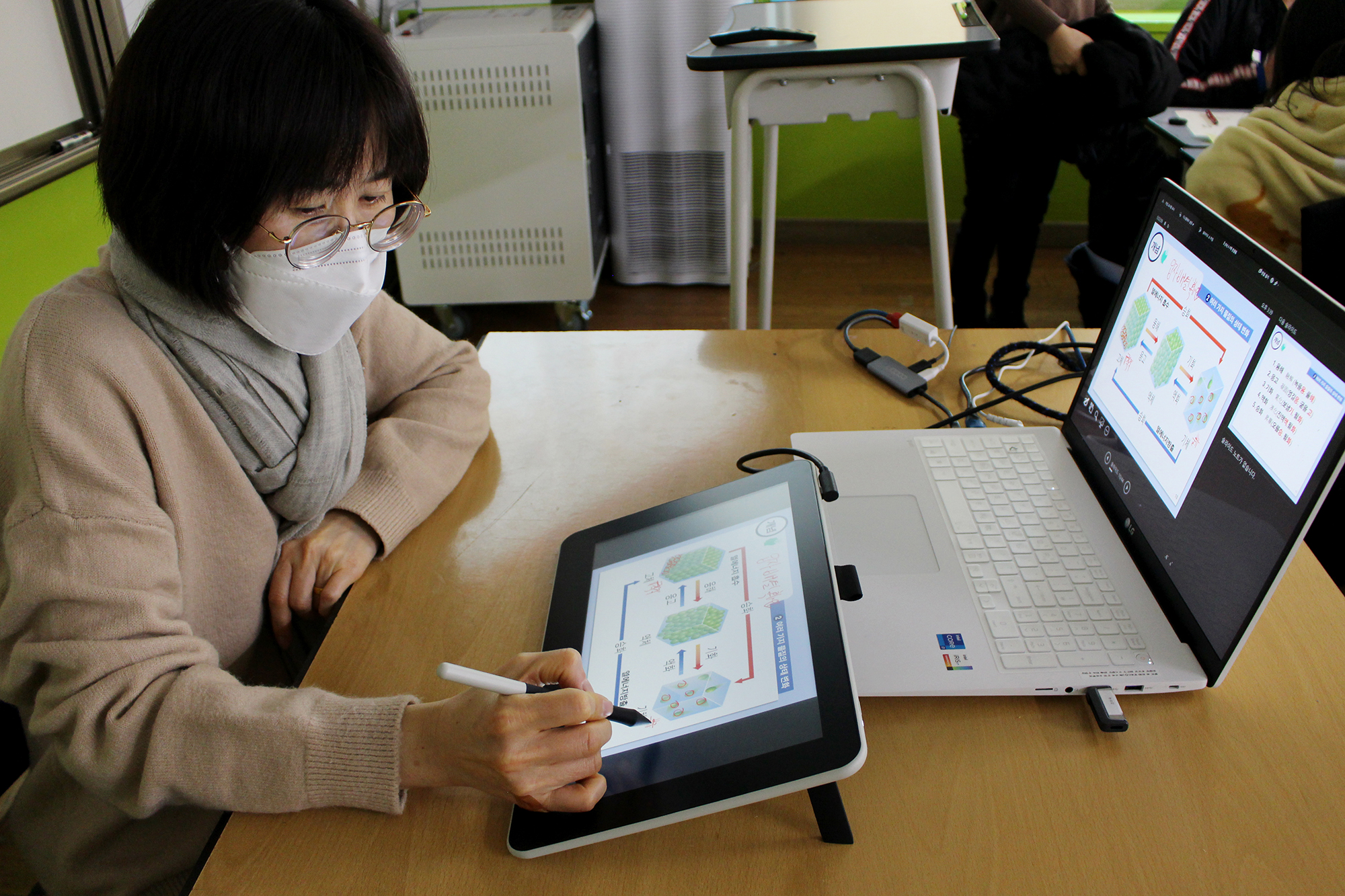 이전에는 교사가 칠판에 판서하는 영상을 촬영해 학생들에게 온라인 교육자료로 전달했지만, 수업 집중도 및 활용성 측면에서 교사와 학생 모두 불만족스러운 방법이었습니다. 그림, 도형, 그래프 등을 직접 그려야 하고, 영상을 편집하는 데에도 많은 시간이 소요됐기 때문이지요. 특히 칠판 전체를 그대로 촬영한 영상은 학생들의 수업 집중도를 떨어트릴 수밖에 없었고요. 하지만 이러한 수업 환경의 변화로 아날로그 방식 보다 디지털 방식에 익숙한 학생들이 타블렛을 활용한 스마트한 수업을 빠르게 받아들여 수업에서 더욱 높은 집중도를 보이고 있다고 해요.