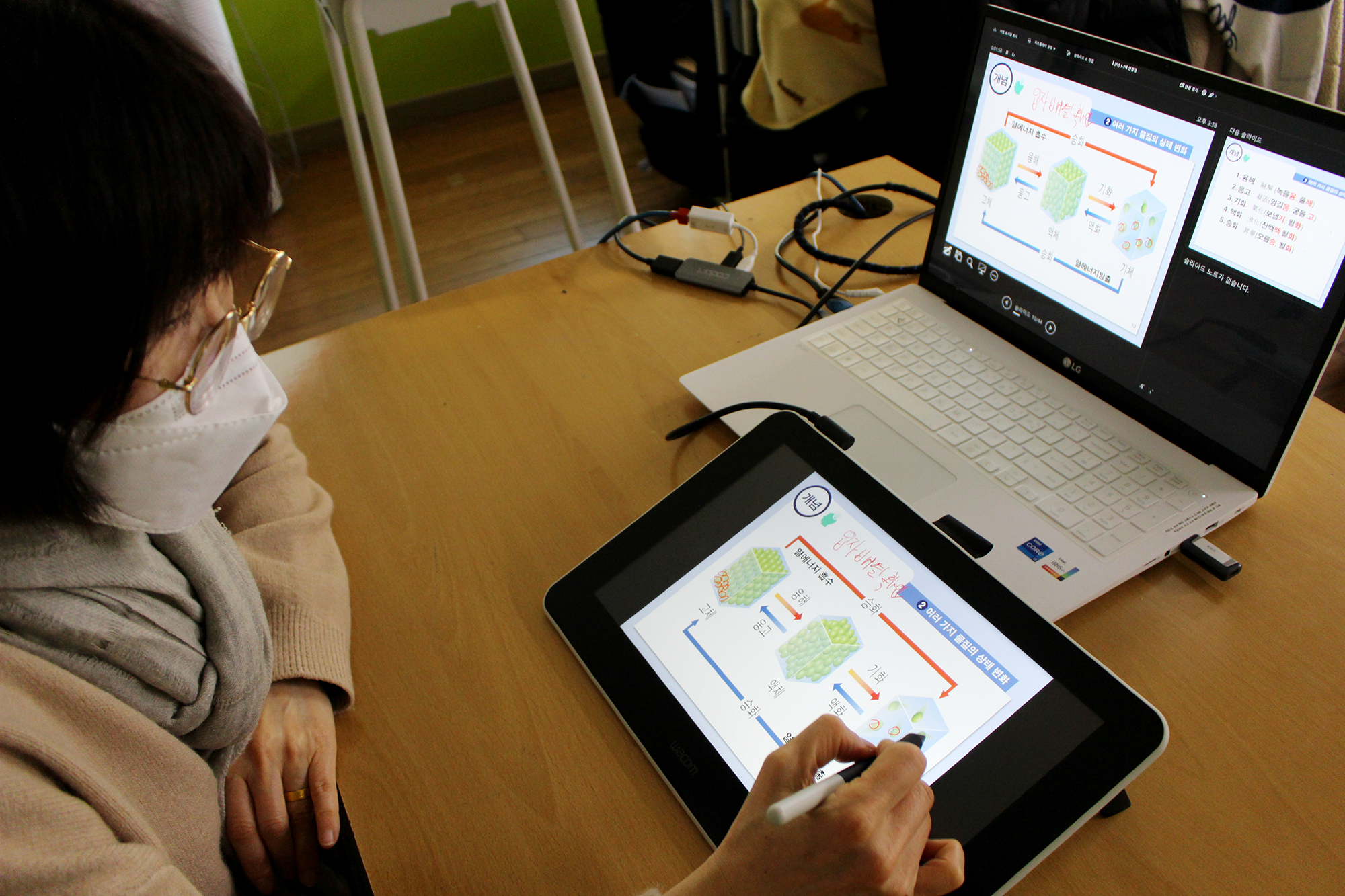 이에 원주여자중학교 조미숙 선생님은 와콤 원을 활용하면 PPT, PDF 등의 디지털 파일은 물론이고, 인터넷에서 필요한 정보를 찾은 후 바로 화면 위에 직접 판서를 할 수 있어 유용하다고 해요. 그리고 수업 자료를 별도로 가공하지 않고 바로 공유할 수 있어 학생들과 공동 작업도 수월하고, 수업 시간 역시 대폭 감소했다고 해요. 이와 함께 와콤 원을 통한 온/오프라인 동시 수업도 한층 더 원활하게 진행되고 있는데요, 코로나 19에 걸린 학생들도 실시간 비대면 수업에서 디지털로 설명된 수업자료를 즉각 공유 받을 수 있다고 해요.