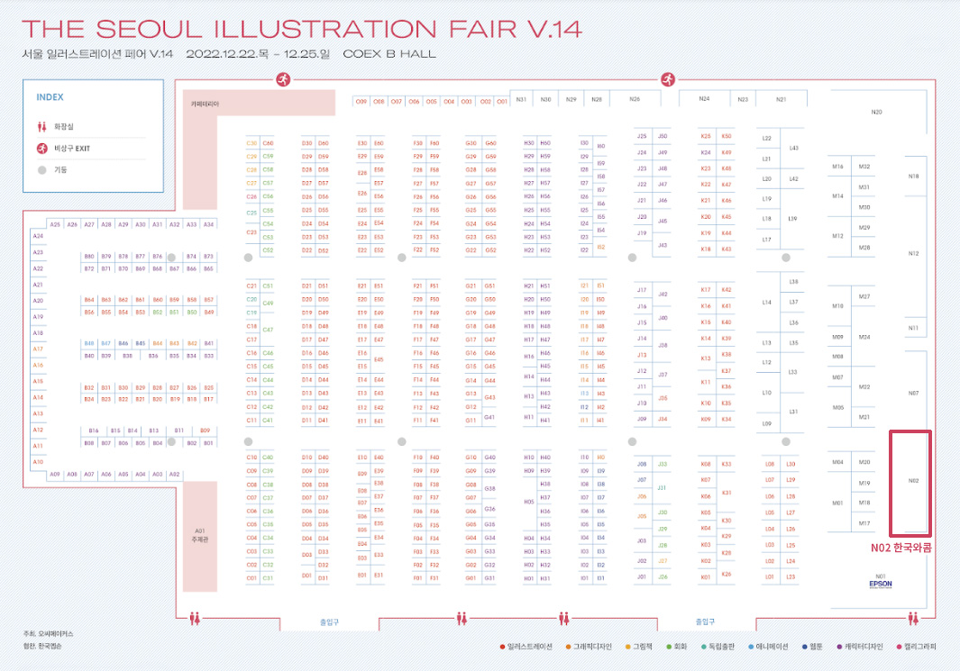 와콤 부스는 N02번 자리에 위치해 있으며, 출입구와 가깝기 때문에 쉽게 찾을 수 있답니다. 위 지도에서 와콤 부스의 위치를 미리 확인해보세요 :)