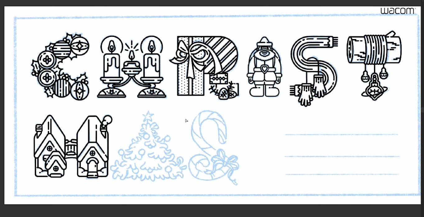 이번 드로잉 웨비나의 주제는 크리스마스입니다. 식상한 크리스마스 인사보다는 직접 그린 이미지로 주변 사람들에게 안부를 전하면 더 좋겠죠? 먼저 127 작가님이 준비해온 스케치를 보여드릴게요. 크리스마스의 영문 스펠링을 이용해서 글자마다 크리스마스에 어울리는 오브제로 만들었어요. 가져온 스케치의 투명도를 조절한 후, 본격적인 작업에 들어갑니다.