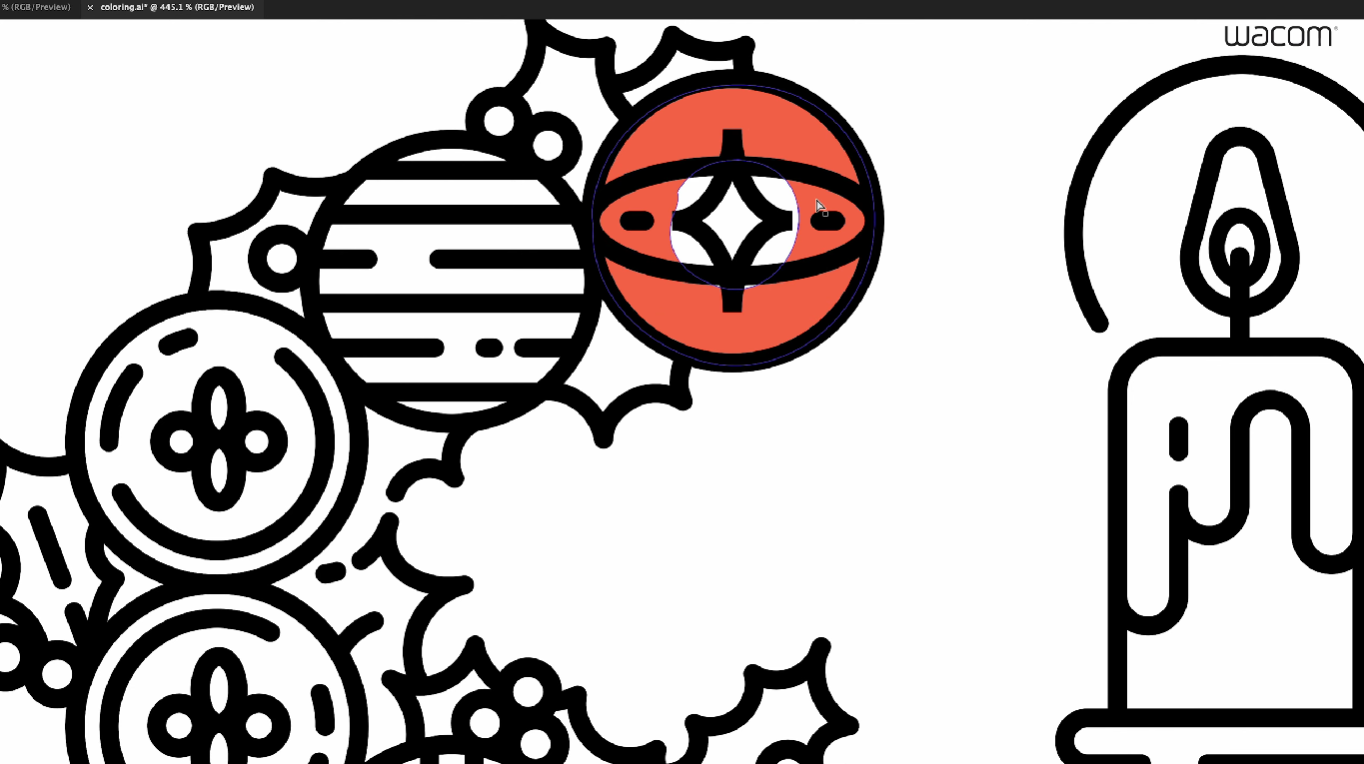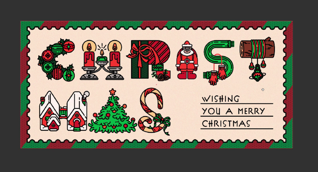 먼저 처음 등장하는 스펠링 C는 트리에 달릴 만한 오너먼트로 구성했어요. 곡선 형태로 작업했는데, 타블렛을 이용하면 곡선을 쉽게 그릴 수 있어서 좋습니다. 그리고 작가님은 기본적으로 일러스트레이터에서 펜툴을 자주 사용하지만, 곡선 형태를 그리거나 좀 더 드로잉 느낌을 주고 싶으면 연필툴을 사용한다고 하네요.