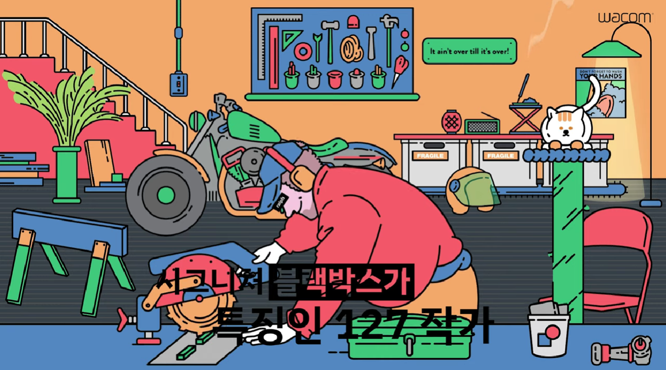 이번 웨비나를 진행한 일러스트레이터 127 작가님의 작품은 볼드한 라인과 비비드한 색감이 특징입니다. 인물 드로잉에서는 작가님의 시그니처인 블랙박스가 특징인데요, 와콤 블로그지기도 이전에 여러 번 작가님의 일러스트를 접한 적이 있답니다. 작가님은 유퀴즈 온 더 블럭 삽화 작업, NCT DREAM 앨범 패키지, 나이키, 스타벅스 등 다양한 클라이언트와 협업을 진행했으며, 현재도 다방면으로 활동하고 있습니다.