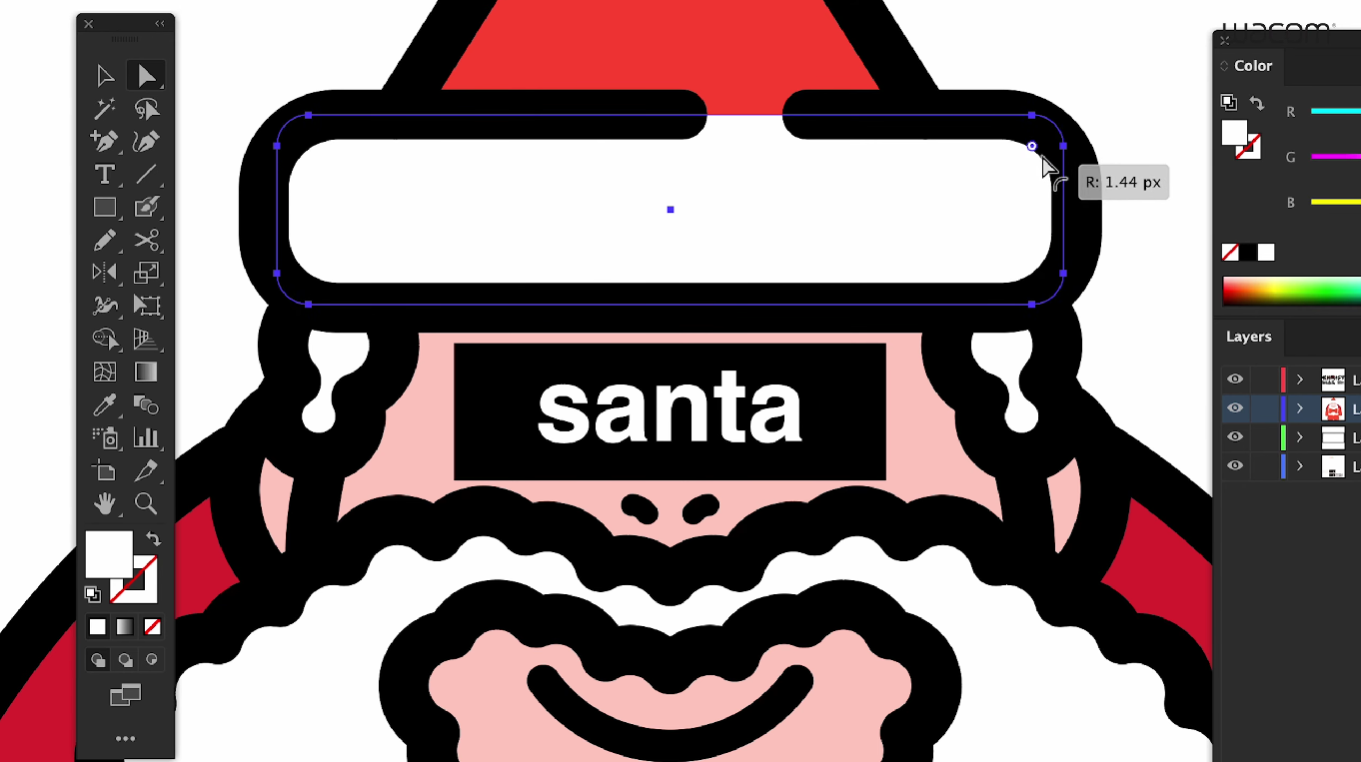 127 작가님의 인물 드로잉 시그니처가 들어간 산타를 색칠해 볼게요. 산타 모자 형태는 모서리가 둥근 직사각형 모양인데, 선택툴을 사용한 상태에서 직사각형을 확인하면 이미지처럼 양 사이드에 동그라미가 보입니다. 이 동그라미를 클릭해서 굴려주면 원하는 만큼 둥글기를 조절할 수가 있어요.