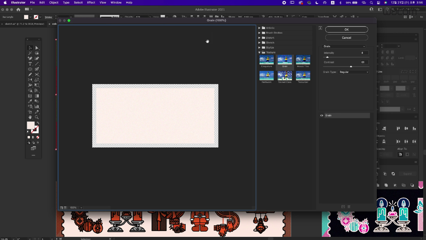 그레인은 이펙트에서 텍스처 창에 들어가면 선택할 수 있습니다. 설정 창에서 강도와 대비를 정할 수 있으며, 127작가님은 밝은 색의 그레인을 넣을 때는 콘트라스트를 강하게 넣는다고 해요. 강도는 자글자글한 정도를 나타내는데, 과하면 부자연스럽기 때문에 적당히 주는 것이 좋습니다. 완성본을 보니까 정말 멋지지요?