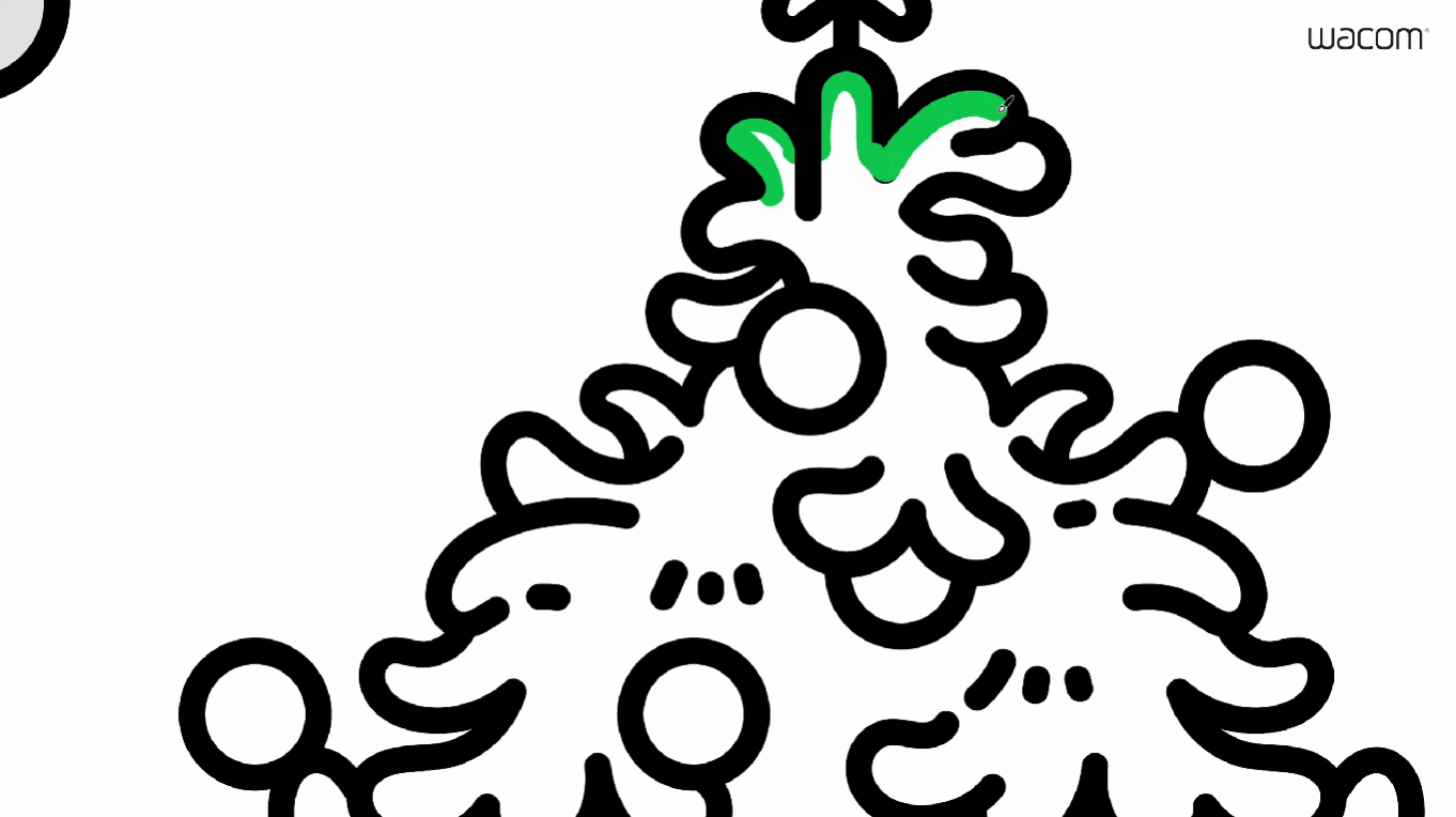 C에서 시작했는데 어느새 A차례가 되었네요! A 스펠링에는 크리스마스 트리를 그려줄 건데요, 뾰족한 침엽수보다는 몽글몽글한 트리 느낌으로 작업해 보겠습니다. 특히 곡선은 와콤 타블렛을 이용하면 맛깔나게 그릴 수 있어요. 127 작가님은 곡선 작업을 할 때 와콤의 장점을 최대치로 느낀다고 합니다. 곡선을 마우스로 그리는 것은 어렵기 때문에, 액정타블렛이 특히 용이하지요.