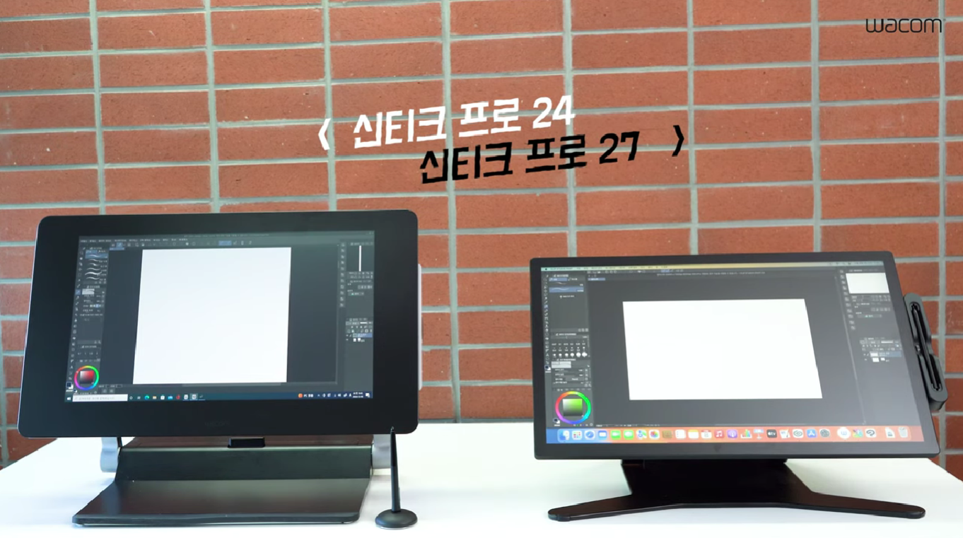 127 작가님은 평소에 작업할 때 와콤 신티크 프로 27 모델을 사용하는데요, 이번 웨비나에서는 특별히 신티크 프로 27을 사용해서 드로잉을 선보였어요. 비교 이미지를 보면, 액정 크기가 더 큰데도 신티크 프로 27의 제품 사이즈가 더 작은 것을 확인할 수 있습니다. 그만큼 제품이 차지하는 공간이 적어져서 작업 공간을 더욱 효율적으로 활용할 수 있지요.