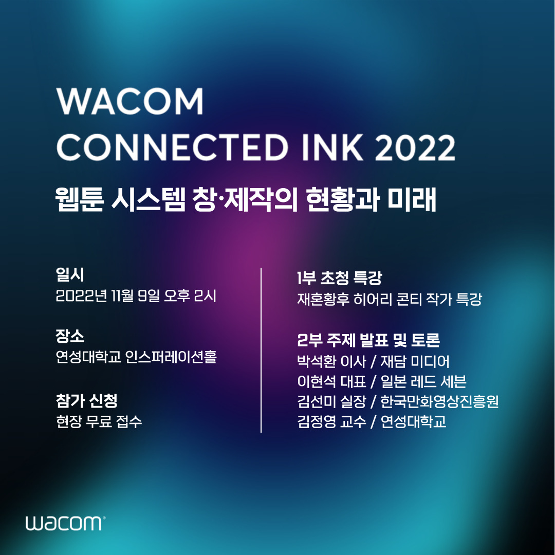 11월에는 와콤의 연간 글로벌 컨퍼런스 행사인 '커넥티드 잉크(Connected Ink) 2022'가 열렸습니다. 온·오프라인으로 진행되는 와콤 커넥티드 잉크 이벤트는 대한민국을 비롯해 일본 도쿄, 중국 상하이, 미국 포틀랜드, 독일 뒤셀도르프 주요 5개국에서 개최되는데요, 한국에서는 연성대학교에서 ‘웹툰 시스템 창작과 제작의 현황과 미래’를 주제로 웹툰 작가 및 업계 관계자들과 함께 발표 및 토론을 진행했어요. 이 날 진행한 컨퍼런스 영상은 커넥티드 잉크 유튜브 채널에서도 확인하실 수 있습니다.