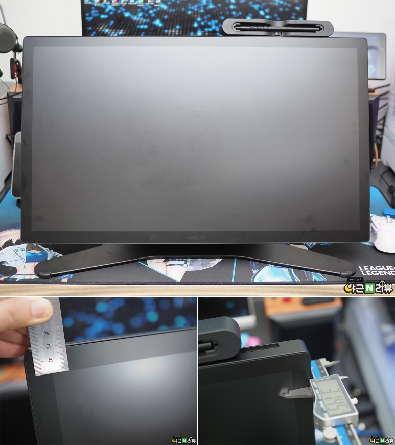 신티크 프로 27은 업그레이드된 디스플레이가 특징인 액정타블렛인데요, 성능뿐만 아니라 외관도 함께 개선되었습니다. 사진에서도 확연하게 줄어든 베젤이 눈에 띄는데요, 직접 재보니 베젤 크기는 2cm. 정말 얇아졌죠? 두께 역시 얇아서 공간을 효율적으로 사용할 수 있습니다. 기존 신티크 프로 24 모델과 비교했을 때, 디스플레이 사이즈는 더 커졌지만 베젤은 줄어들었기 때문에 전체적인 타블렛 사이즈는 오히려 감소했어요.