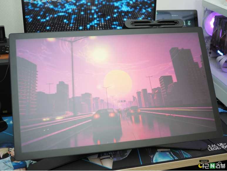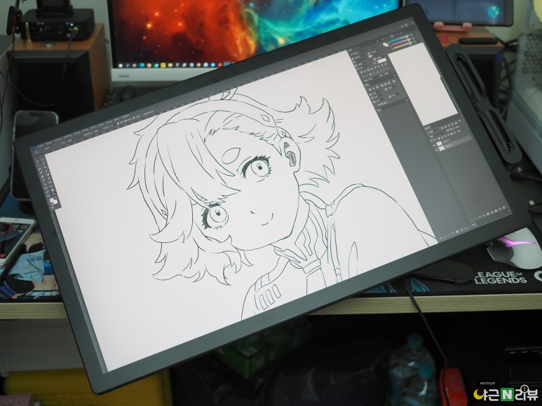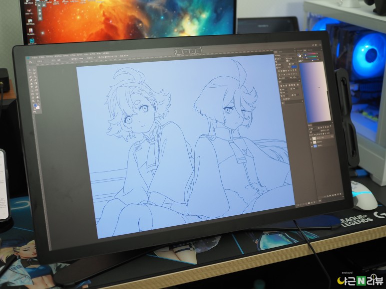 신티크 프로 27 화면을 켠 모습입니다. 신티크 프로 27의 디스플레이는 DCI-P3 색영역을 98% 구현하고 어도비 RGB 색상을 99% 구현합니다. 또, 팬톤 컬러와 스킨톤 검증까지 받은 제품이에요. 뛰어난 디스플레이 스펙 덕분에, 창작 활동뿐만 아니라 게임이나 영상 시청 용도로 사용하기도 좋습니다.