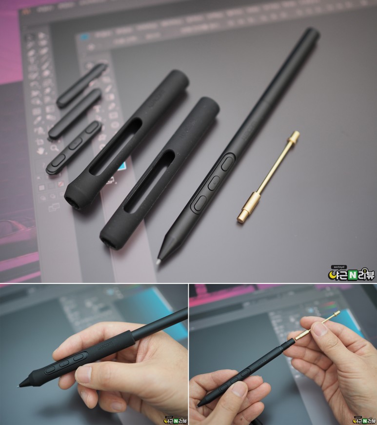 프로 펜 3는 유저의 취향에 맞추어 커스터마이징이 가능해요. 펜 그립은 기본 상태에서 일자형인 스트레이트와 플레어 2가지가 추가 제공되고, 단축키 설정이 가능한 사이드 버튼 역시 사용 여부를 결정할 수 있어요. 무게추 역시 취향에 따라 사용 가능하기 때문에 커스텀 가능한 옵션이 무려 최대 36가지랍니다. 무게 추는 양쪽의 무게가 다르게 설정되어 방향에 따라 무게 중심이 바뀌는데, 섹토이드님은 무게가 앞으로 오는 게 더 편했다고 하네요.