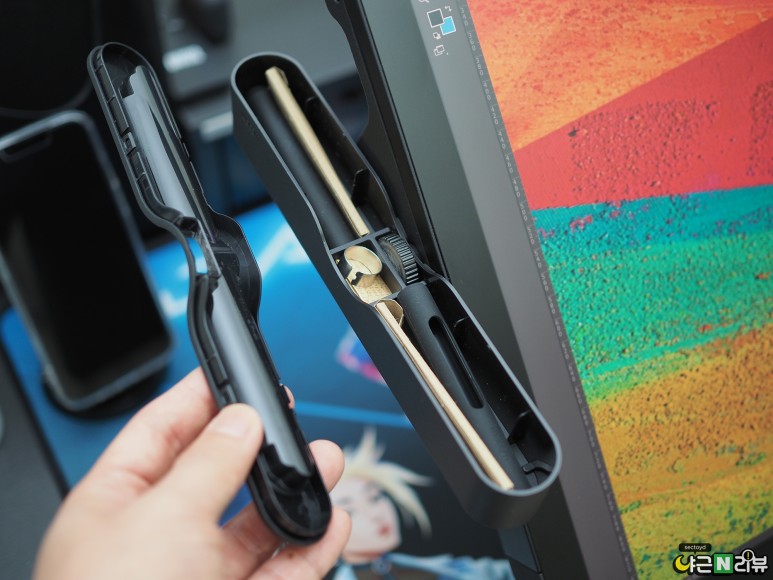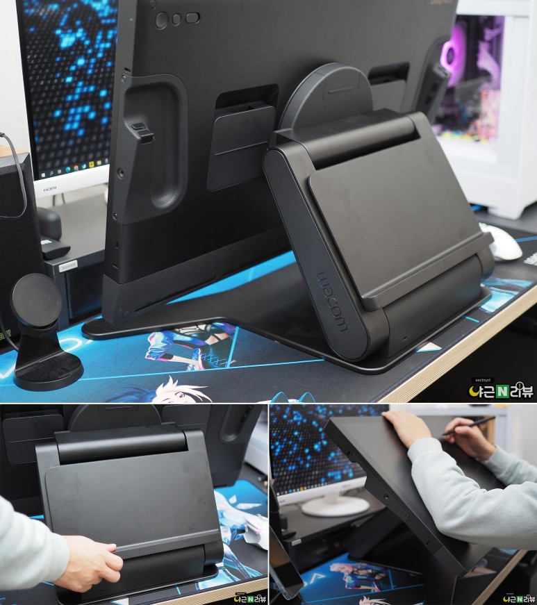 신티크 프로 27은 스탠드가 내장되어 있지 않아서 전용 스탠드와 함께 사용해야 하는데요, 공중 고정이 가능하고 이전 모델의 스탠드보다 부피가 많이 줄어서 실사용 만족도가 높은 제품이에요. 섹토이드님이 타블렛을 공중에 거치한 상태로 체중을 실어 기대도 틀어지지 않을 정도로 단단했습니다. 타블렛 부피가 줄어들면서 뒷면의 홀더 사용도 불편하지 않았고요.