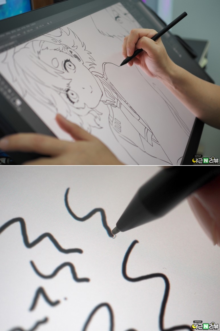 이제 신티크 프로 27을 사용해봐야겠죠? 이번 제품의 가장 큰 스펙상 변화로는 120Hz의 고주사율을 꼽을 수 있는데요, 120Hz 주사율을 사용하기 위해서는 그래픽카드 드라이버에서 따로 설정을 해줘야 합니다. 설정을 마치고 나면 선을 빠르게 그을 때 그 성능을 체감할 수 있어요. 섹토이드님은 전체적으로 드로잉할 때 부드러운 펜 움직임을 느꼈고, 또 유격이 줄어들면서 포인트 정확도가 높아져 이질감이 느껴지지 않았다고 합니다.
