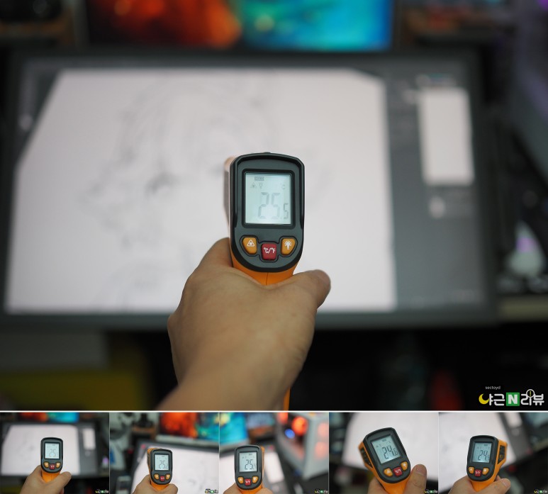 그리고 액타 사용할 때 발열 걱정하는 분들 많으시죠? 섹토이드님이 직접 측정한 신티크 프로 27의 발열! 하루종일 기기를 켜두고 사용하다가 저녁쯤 온도를 측정했는데, 화면 중앙부터 테두리까지 온도가 높게 나오지 않았습니다. 실제로 손과 팔을 대고 있어도 뜨끈하지 않았고요.