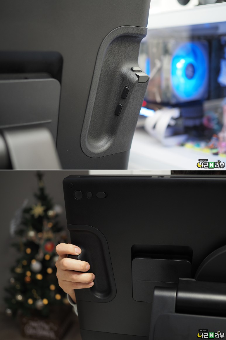 신티크 프로 27은 유저들의 편의를 위해 익스프레스 키가 제품 뒷면에 내장되는 형식으로 바뀌었습니다. 제품 양측 뒷면에 각 4개, 총 8개의 익스프레스 키 버튼이 있어요. 양쪽에 있기 때문에 왼손잡이들도 불편함 없이 익스프레스 키를 사용할 수 있답니다. 섹토이드님은 그립 부분이 가죽 느낌이고, 익스프레스 키가 있는 위치도 사용하기 괜찮았다는 소감을 남기셨어요.