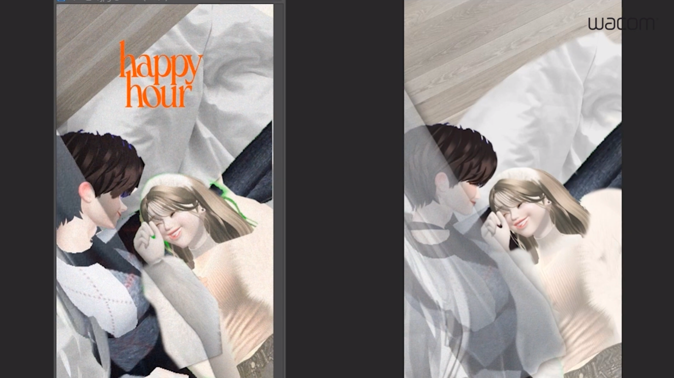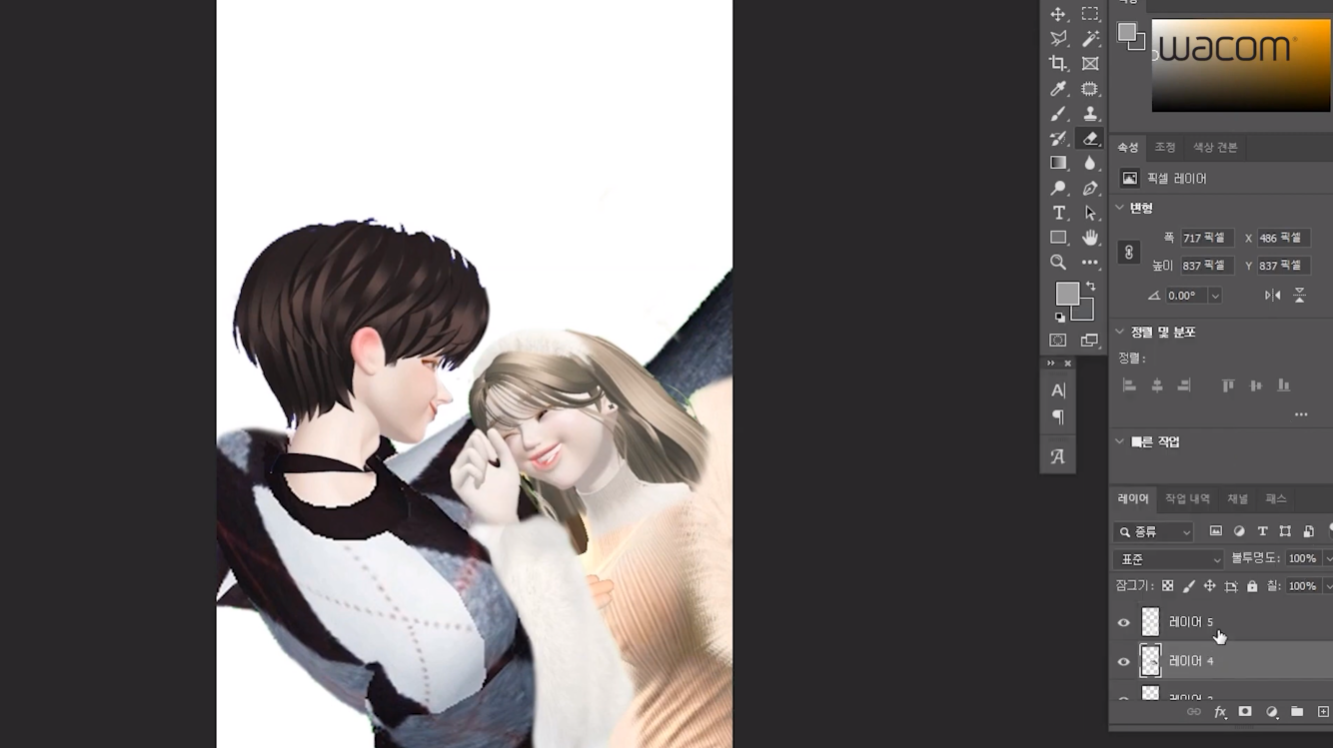 자연스러운 연출을 위해 여자 캐릭터도 원하는 부분을 잘라온 후, 투명도를 낮춰서 자연스럽게 나머지 부분을 지워줄게요.