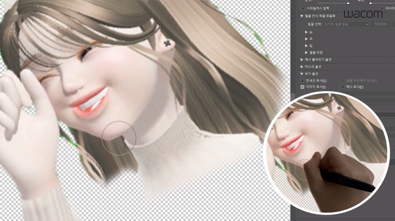 가장 중요한 부분 중 하나인 얼굴! 확대해서 원하는 대로 수정해주세요. 턱을 다듬는 것부터 시작해서 조금씩 캐릭터를 바꿔가는 재미가 있습니다. 수정 작업 역시 프로 펜 2로 디테일하게!