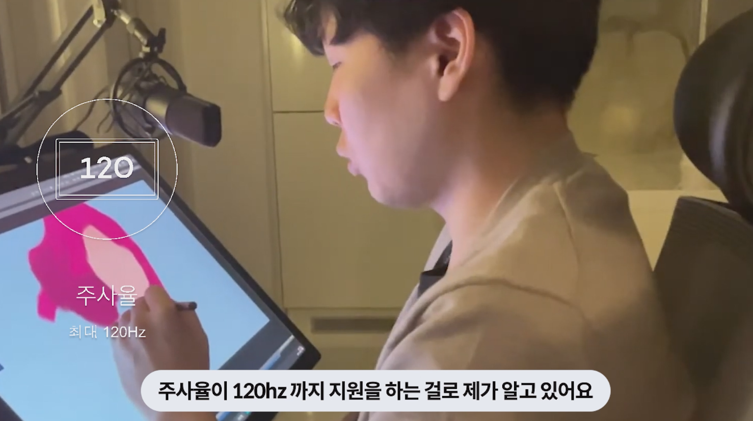 그리고 와콤이 신티크 프로 27에 신경을 정말 많이 썼다고 느껴지는 이유, 주사율! 디스플레이는 120Hz의 주사율을 지원하는데, 주사율이 높아져서인지 인식 속도도 함께 좋아졌습니다. 평준님은 신티크 프로 27으로 타블렛만 바꿨을 뿐인데, 컴퓨터가 그대로임에도 반응 속도가 빨라져서 작업하는 데 아주 편해졌다고 해요.