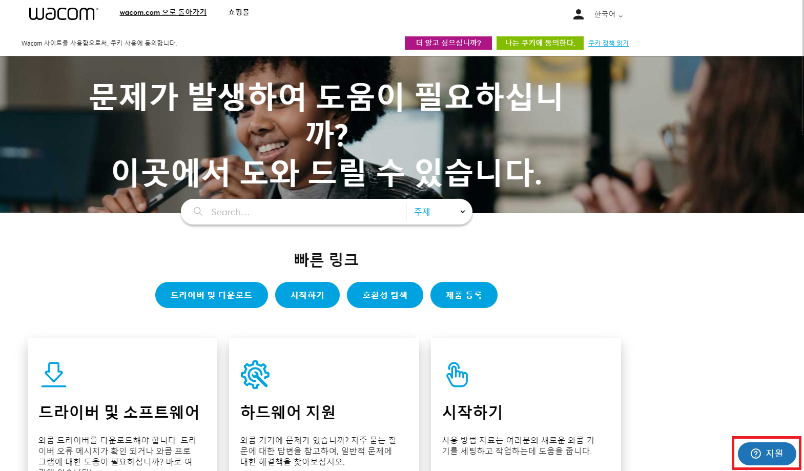 A. 제품 고장 관련 문의는 와콤 고객센터(080-800-1231) 또는 와콤 홈페이지 온라인 지원 신청을 이용해주세요. 온라인 지원 페이지에서는 실시간 채팅 기능도 제공하고 있는데요, 지원 페이지 우측 하단의 지원 아이콘을 누르면 라이브 채팅 기능을 이용하실 수 있습니다.