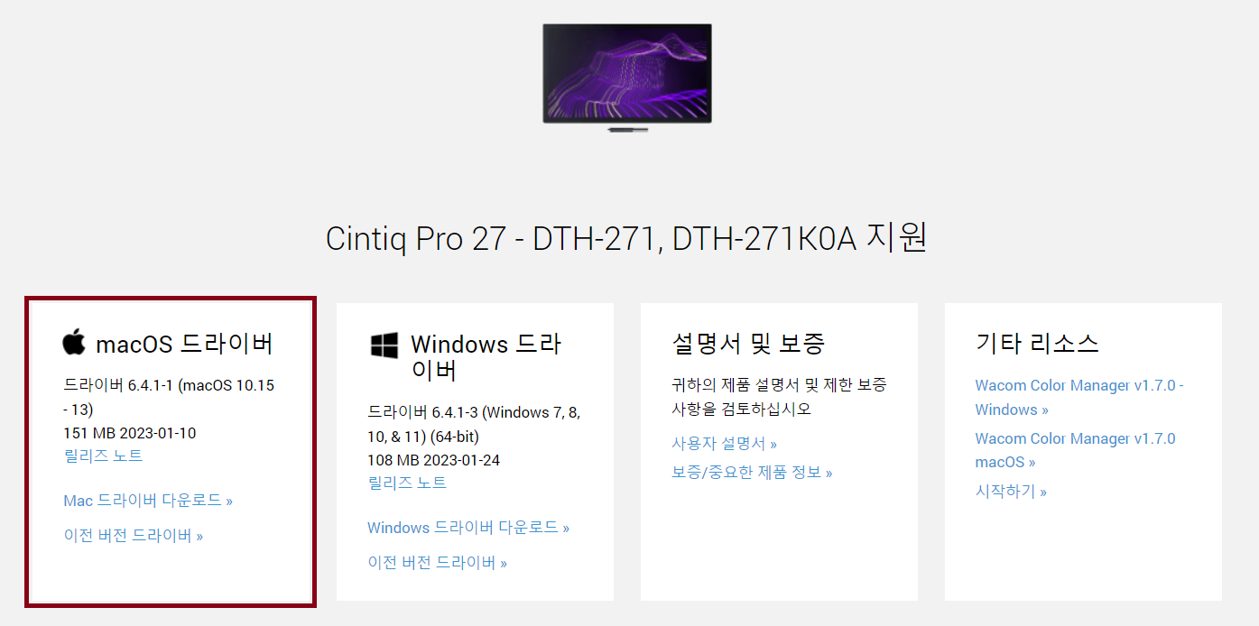 A. 와콤 타블렛은 Mac OS 기반의 맥북, 아이맥에서 사용할 수 있습니다. Mac OS 제품 사용 시에는 반드시 Mac용 드라이버를 설치해야 하는 점, 잊지 마세요! 타블렛 모델에 따라 지원하는 MacOS는 상이하며, 자세한 내용은 드라이버 다운로드 페이지에서 확인 가능합니다. 아래 이미지처럼 해당되는 OS가 기재되어 있어요.