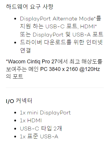 A. 와콤 타블렛은 제품에 따라 HDMI 뿐만 아니라 Display Port, Mini Display Port , USB-C 썬더볼트 등으로도 영상 신호를 수신할 수 있습니다. 공식 홈페이지에서 각 타블렛 제품의 상세정보를 확인하면 아래와 같이 입/출력 포트 종류를 확인하실 수 있어요.